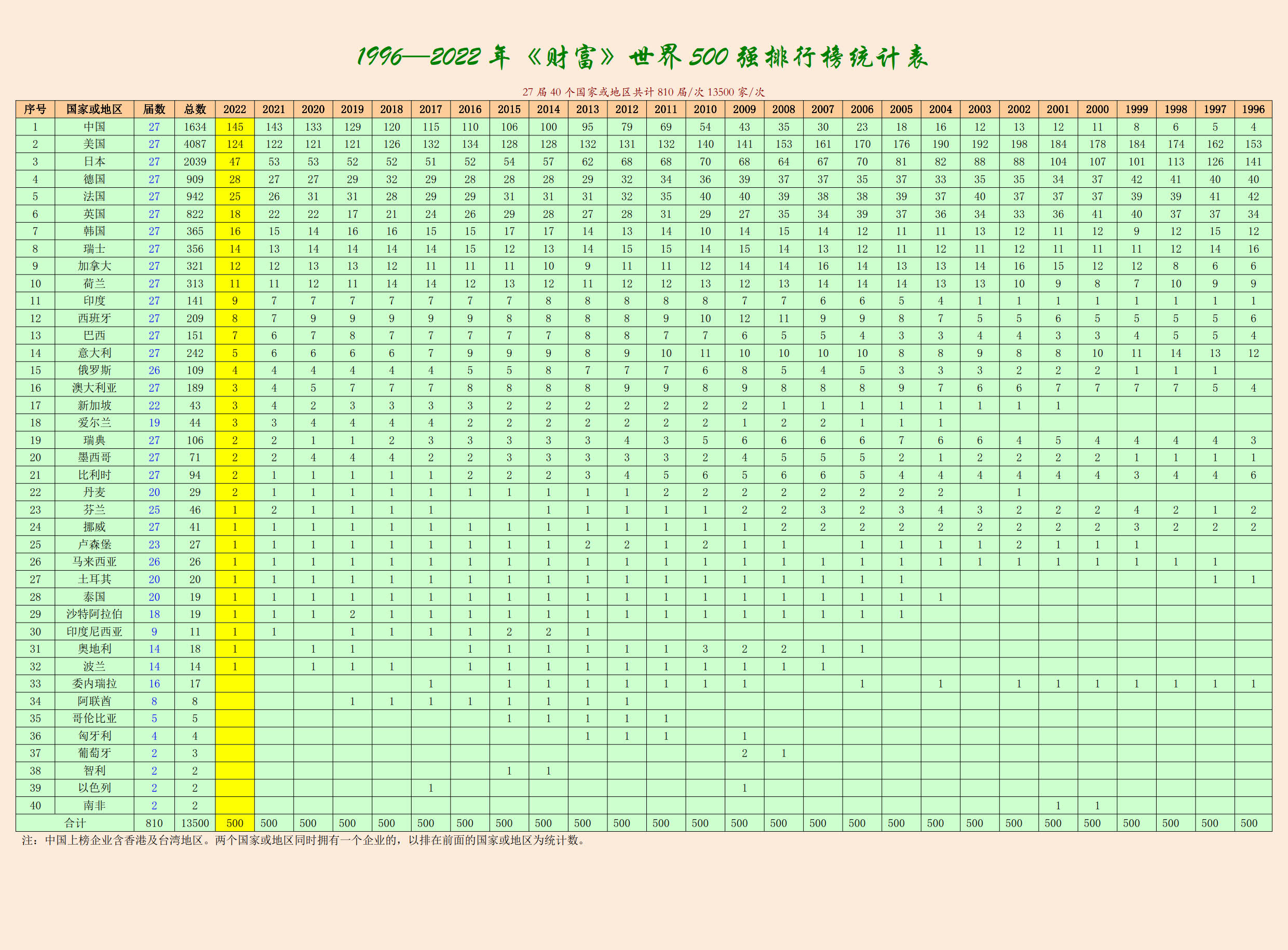 1996-2022世界500強排行榜統計表(按上榜數量)