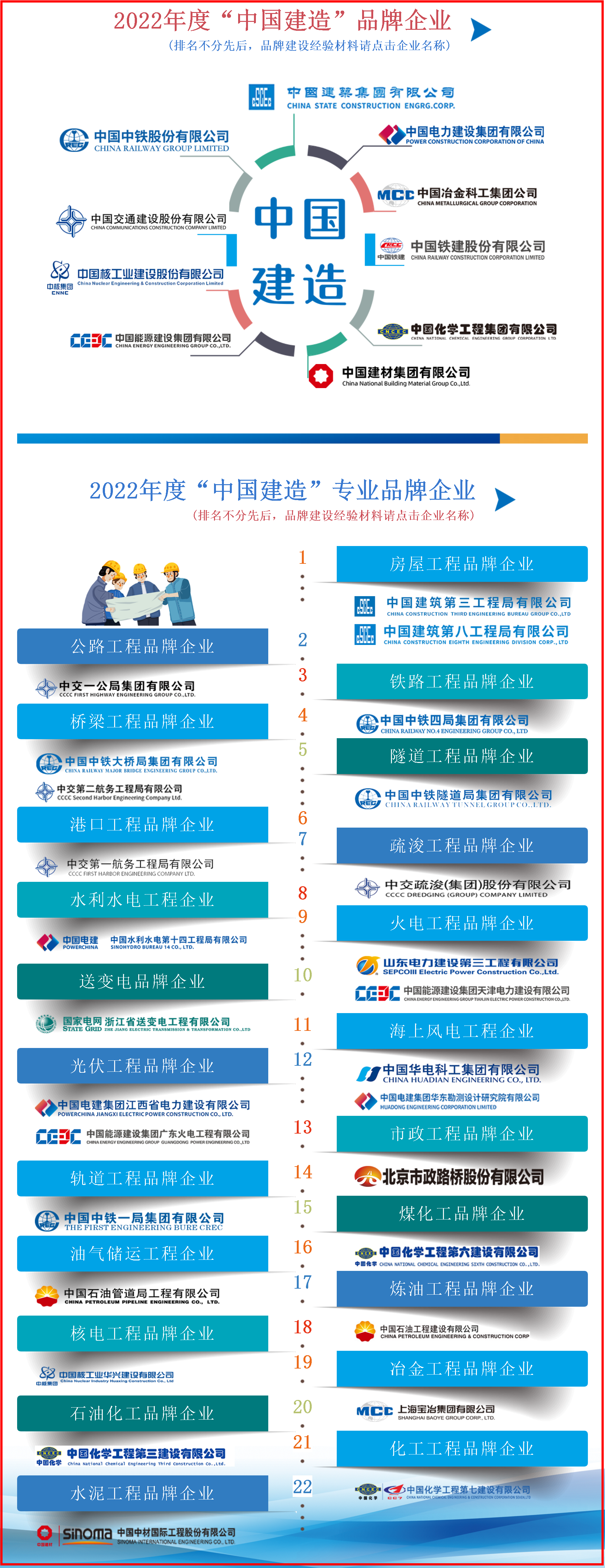 中國施工企業管理協會深入踐行新時代品牌強國戰略,在第6個中國品牌日到來之際,組織開展了一系列工程建設企業品牌建設宣傳活動。5月5日,專門下發《關于加強工程建設企業品牌建設的指導意見》,5月9日,下發《關于開展工程建設企業品牌建設宣傳活動的通知》,著力提升工程建設企業品牌建設能力。 協會結合行業實際,重點在房屋工程、公路工程、鐵路工程、橋梁工程、隧道工程、港口工程、疏浚工程、水利水電工程、火電工程、送變電工程、海上風電工程、光伏工程、市政工程、軌道工程、煤化工工程、油氣儲運工程、煉油工程、核電工程、冶金工程、石油化工工程、化工工程、水泥工程等領域,遴選一批在品牌建設上具有代表性、先進性、引領性的專業品牌企業,將其經驗做法在協會官網設置“中國建造品牌宣傳”專欄刊發,供全行業學習借鑒。