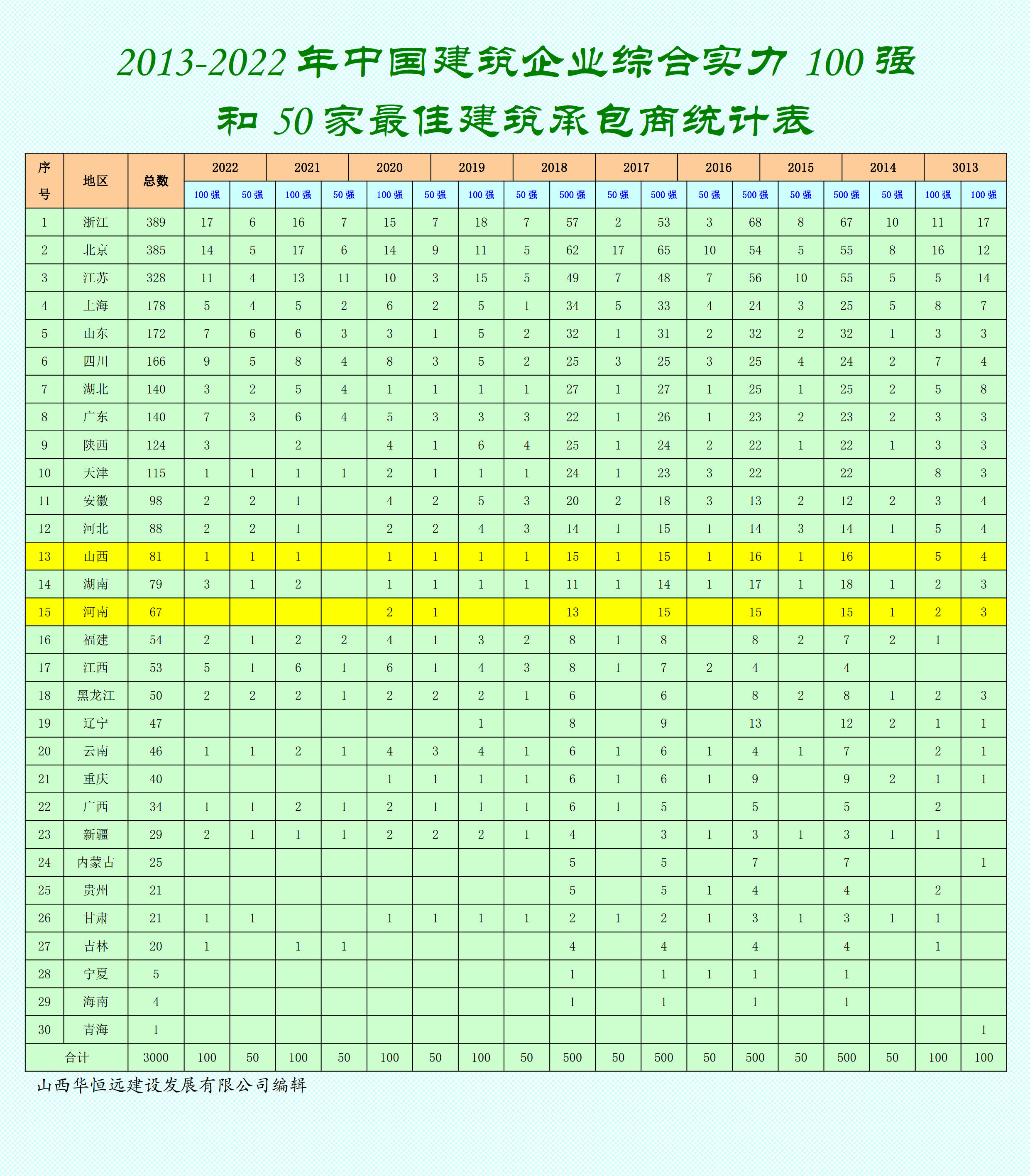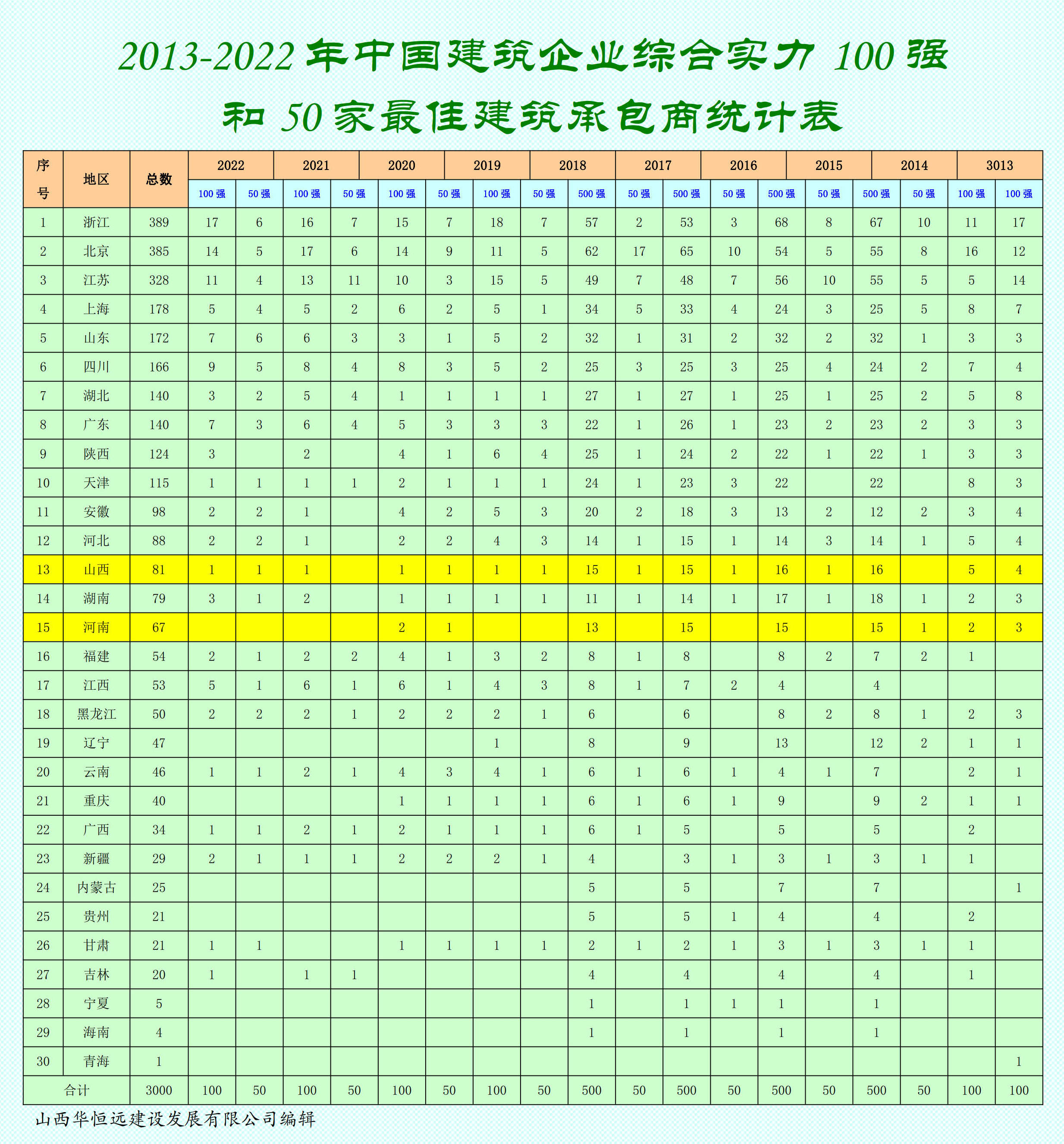 2013-2022年中國建筑企業綜合實力100強和50家最佳建筑承包商排行榜?