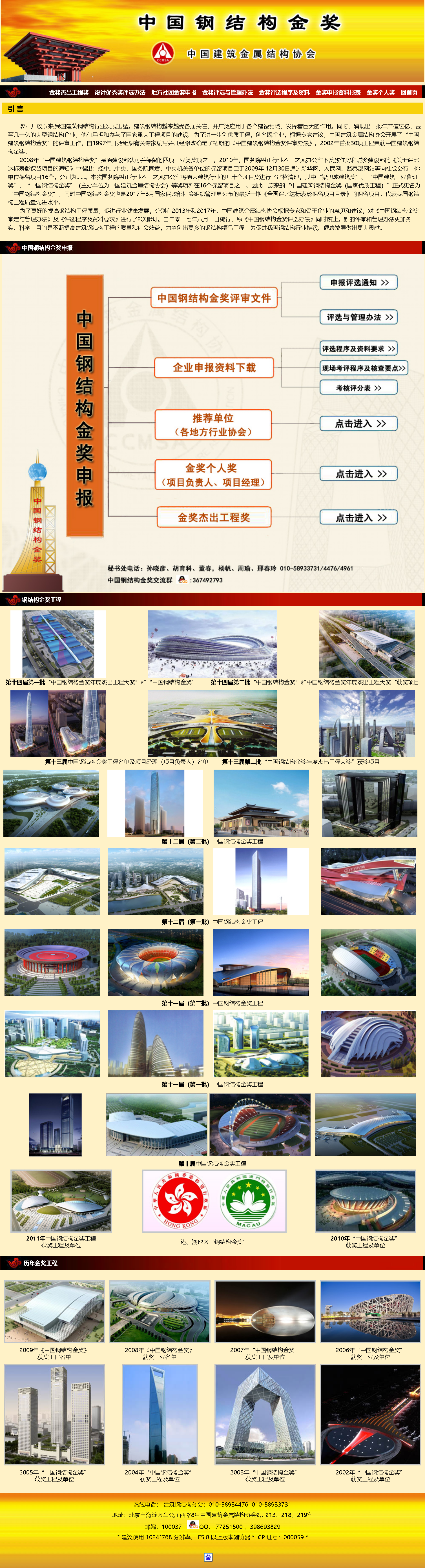 改革開放以來,我國建筑鋼結構行業發展迅猛。建筑鋼結構越來越受各屆關注,并廣泛應用于各個建設領域,發揮著巨大的作用。同時,涌現出一批年產值過億,甚至幾十億的大型鋼結構企業,他們承擔和參與了國家重大工程項目的建設。為了進一步創優質工程,創名牌企業,根據專家建議,中國建筑金屬結構協會開展了“中國建筑鋼結構金獎”的評審工作,自1997年開始組織有關專家編寫并幾經修改確定了初期的《中國建筑鋼結構金獎評審辦法》。2002年首批30項工程榮獲中國建筑鋼結構金獎。