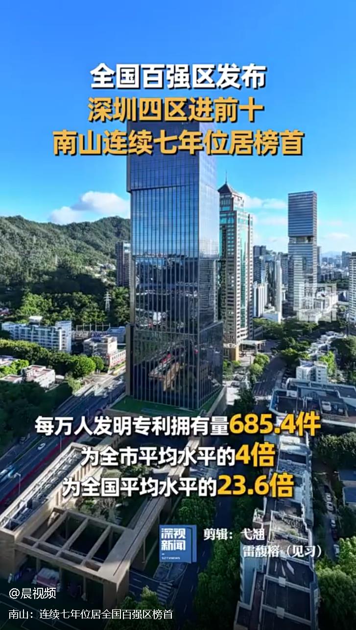 8月2日,賽迪顧問城市經濟研究中心發布“2024賽迪百強區”榜單,深圳南山區排名第一,這也是南山區連續7年位居全國百強區榜首。