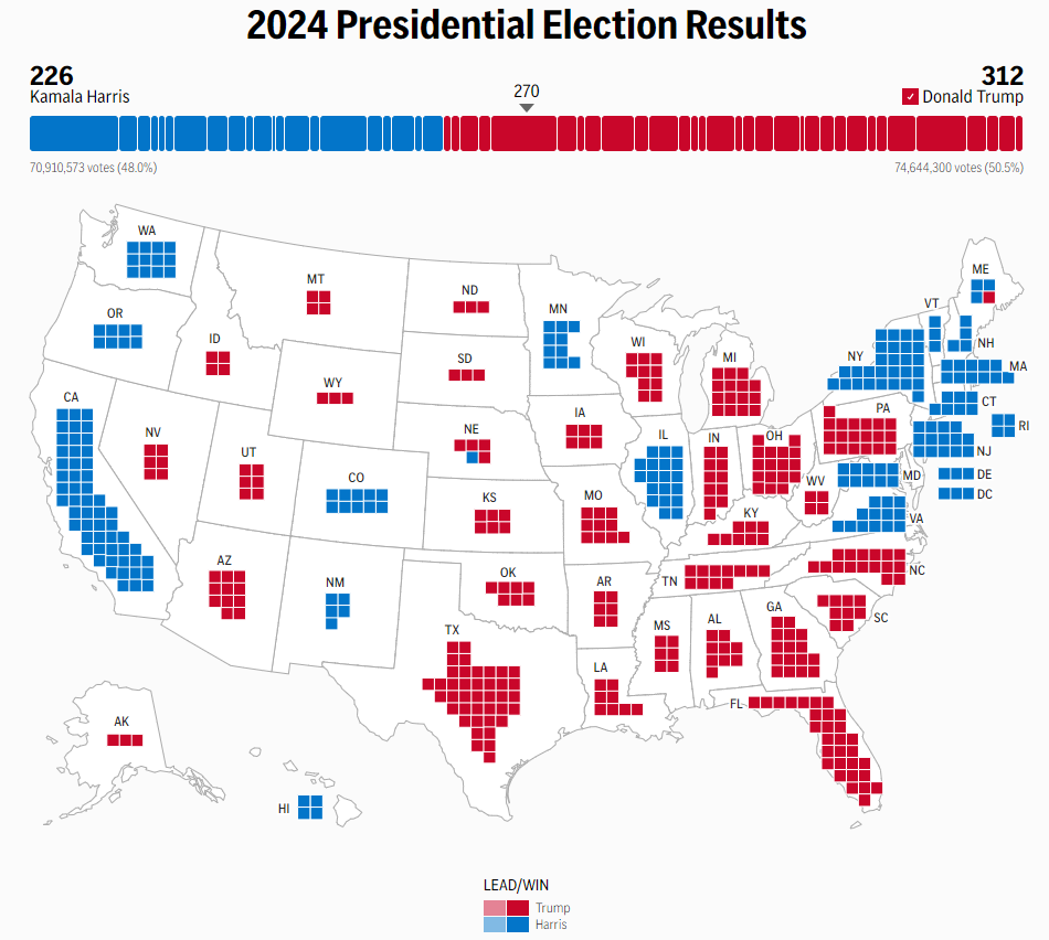 根據(jù)美國國家廣播公司的測算,目前美國各州的普選結(jié)果均已出爐,特朗普獲得74519466張普選選票,總計獲得312張選舉人票;民主黨總統(tǒng)候選人哈里斯獲得70833032張普選選票,總計獲得226張選舉人票。