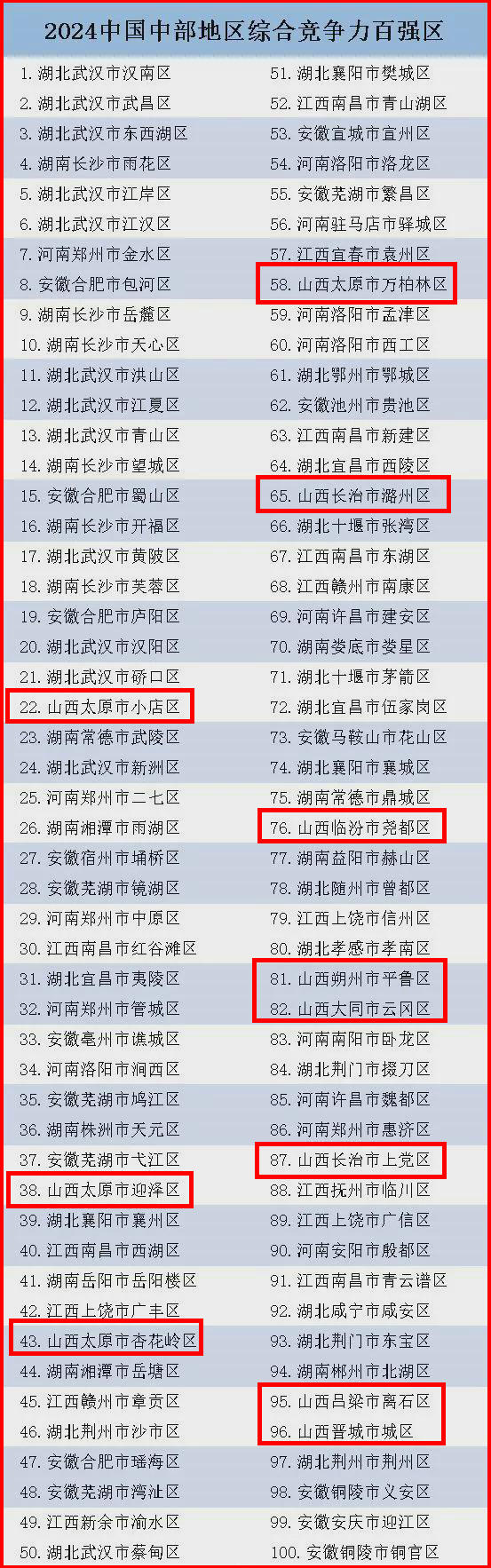 本報訊(記者丁園)日前,競爭力智庫、北京中新城市規(guī)劃設計研究院等機構在京發(fā)布《中國縣域發(fā)展監(jiān)測報告2024》(以下簡稱《報告》)。其中,在2024中國中部地區(qū)綜合競爭力百強區(qū)榜單中,我省共有11個區(qū)上榜,太原市以4個區(qū)位居全省之首。