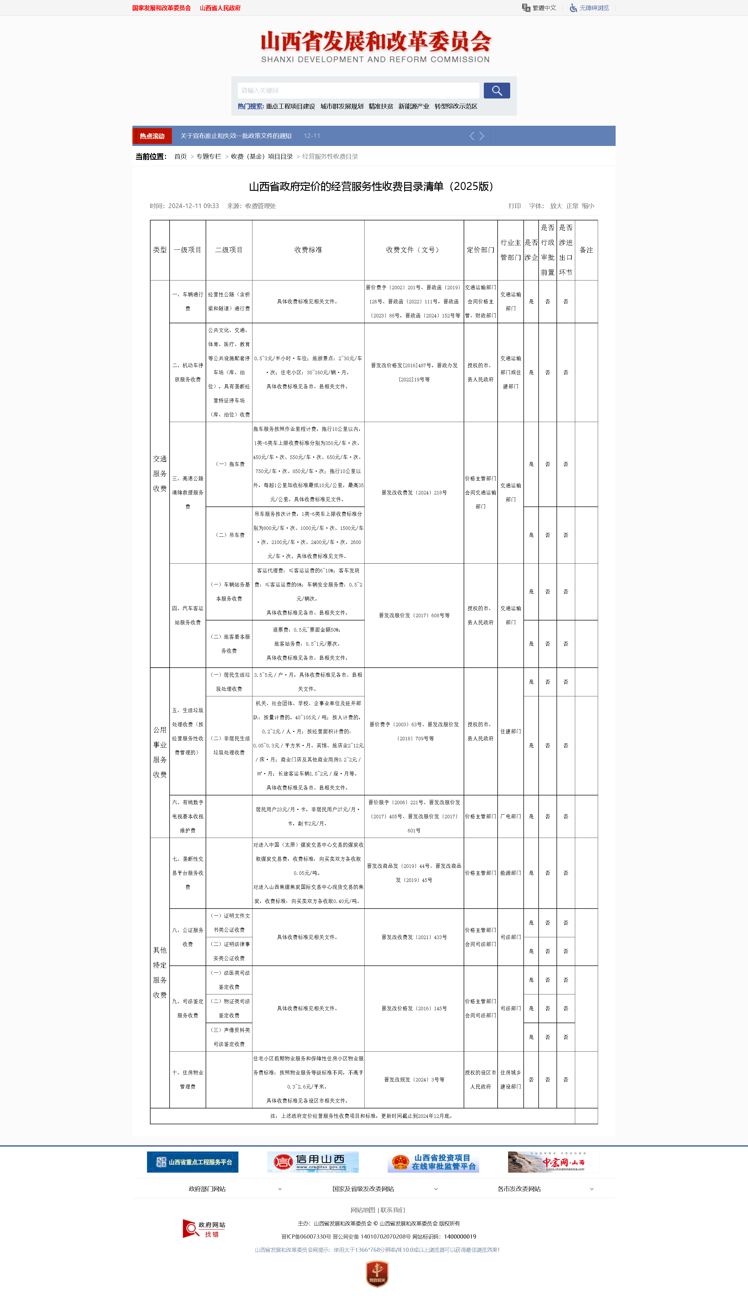 【綜合信息】山西省政府定價的經營服務性收費目錄清單(2025版)