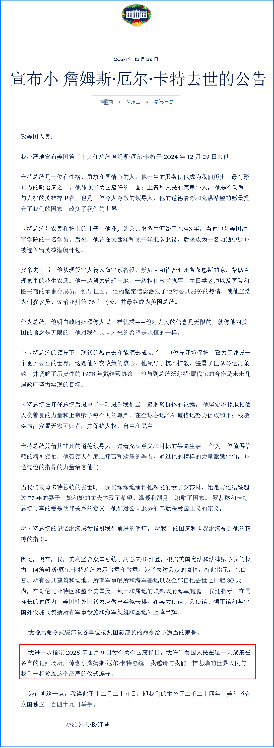 新華社華盛頓12月29日電 美國白宮29日說,2025年1月9日為全國哀悼日,美國總統拜登呼吁美國人民在那一天向前總統吉米·卡特“表達敬意”。