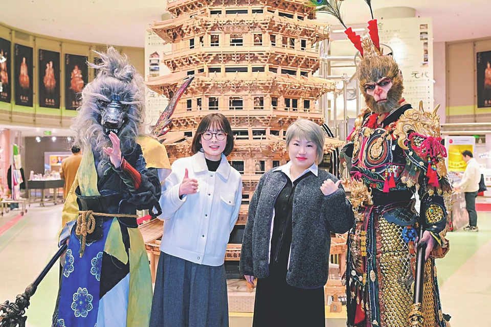 展覽現(xiàn)場,參觀者與“悟空”等IP形象合影。本報記者栗美霞攝