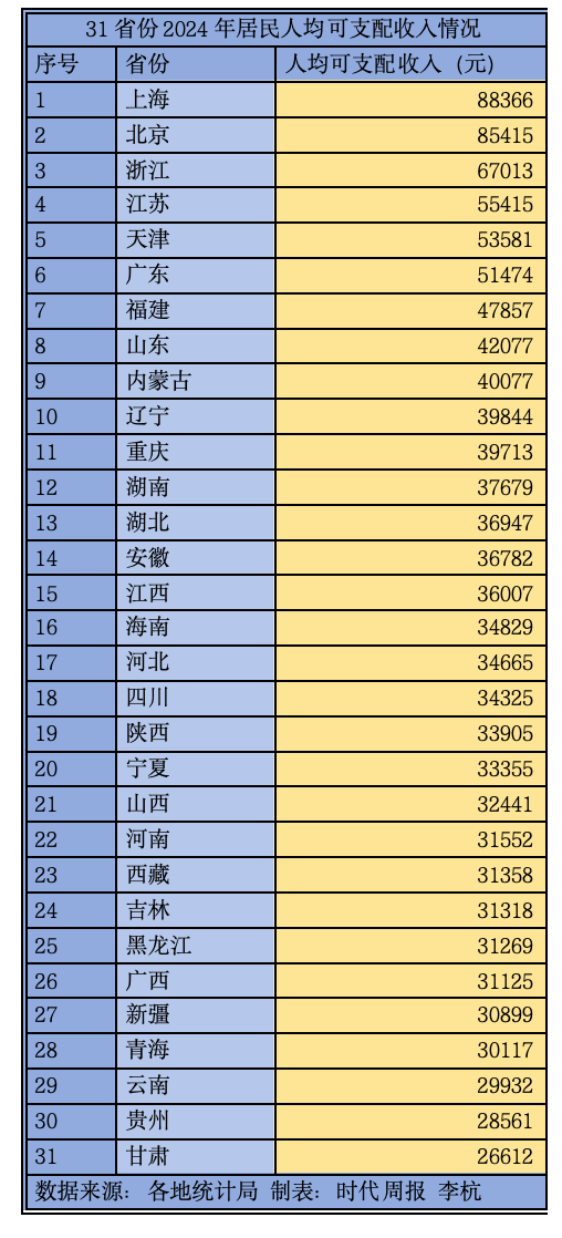 2024年,共有9省份居民人均可支配收入超過了4萬元,分別是上海、北京、浙江、江蘇、天津、廣東、福建、山東和內蒙古。