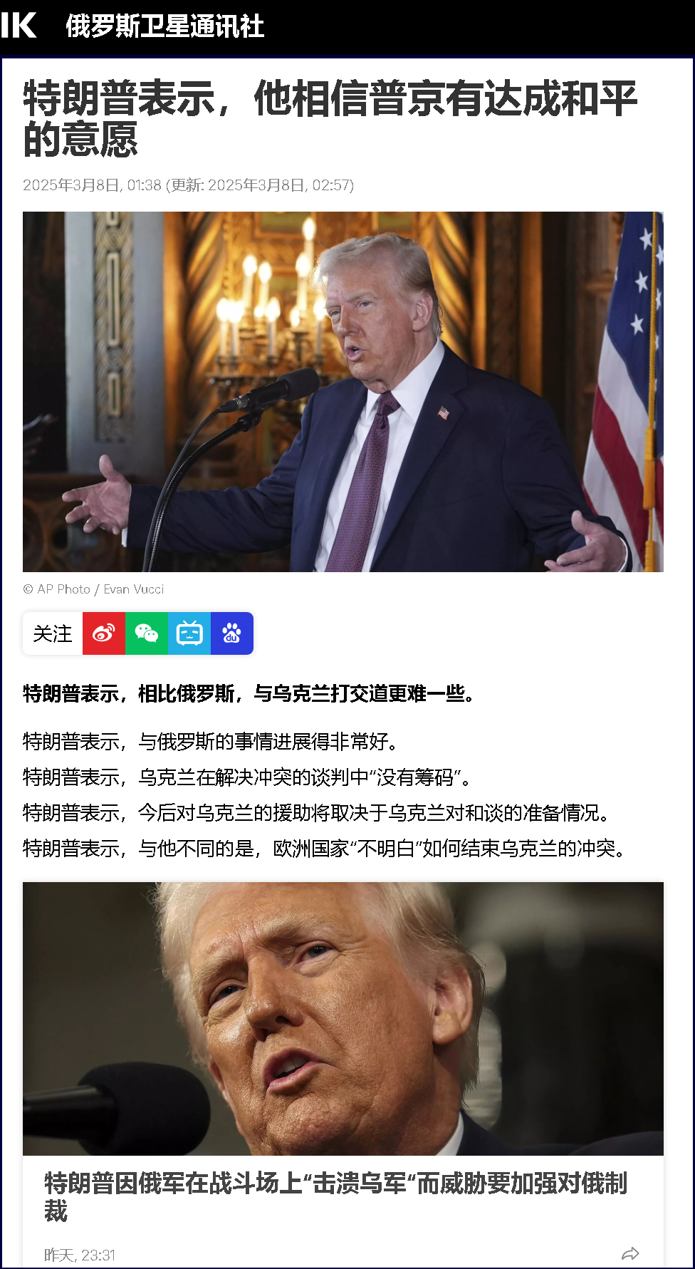 特朗普說,鑒于俄羅斯目前在戰場上“猛烈打擊”烏克蘭,他強烈考慮對俄實施包括針對銀行業在內的大規模制裁以及加征關稅,以向其施壓達成停火和最終和平協議。特朗普還敦促俄羅斯和烏克蘭“坐到談判桌上”。