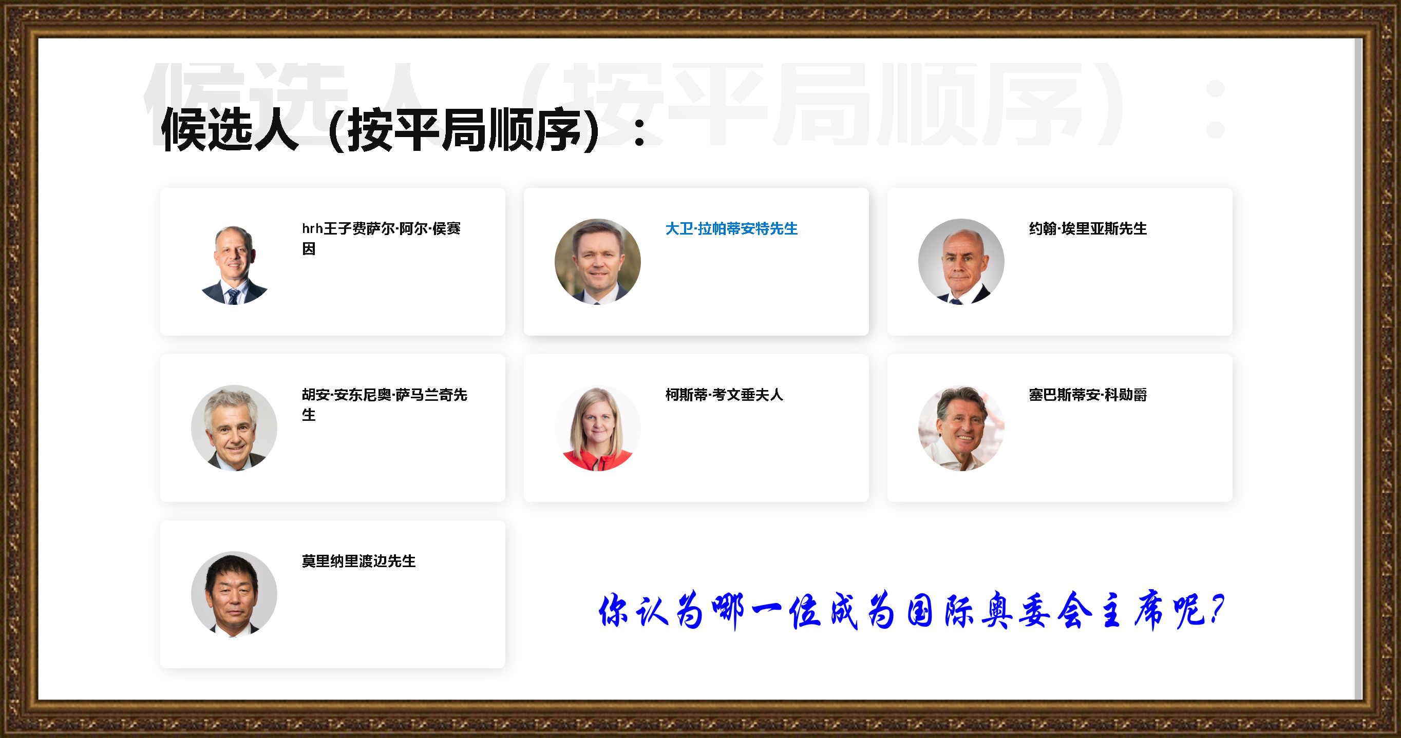 去年12月,這七位候選人公布了各自的競選綱領。今年1月,他們在洛桑一一向全體委員作閉門陳述,這是投票前唯一一次當眾闡釋其個人競選主張的機會。本次全會期間他們將不再進行其他形式的陳述。今年2月的哈爾濱亞冬會,這七人悉數到場,抓住競選前為數不多的公開場合加緊公關活動。