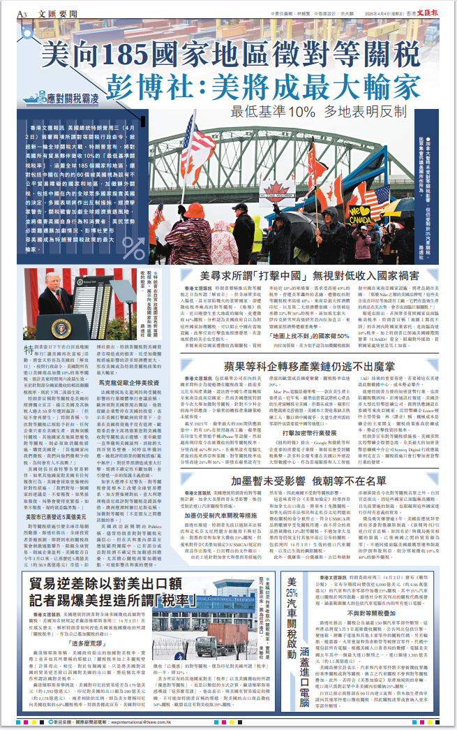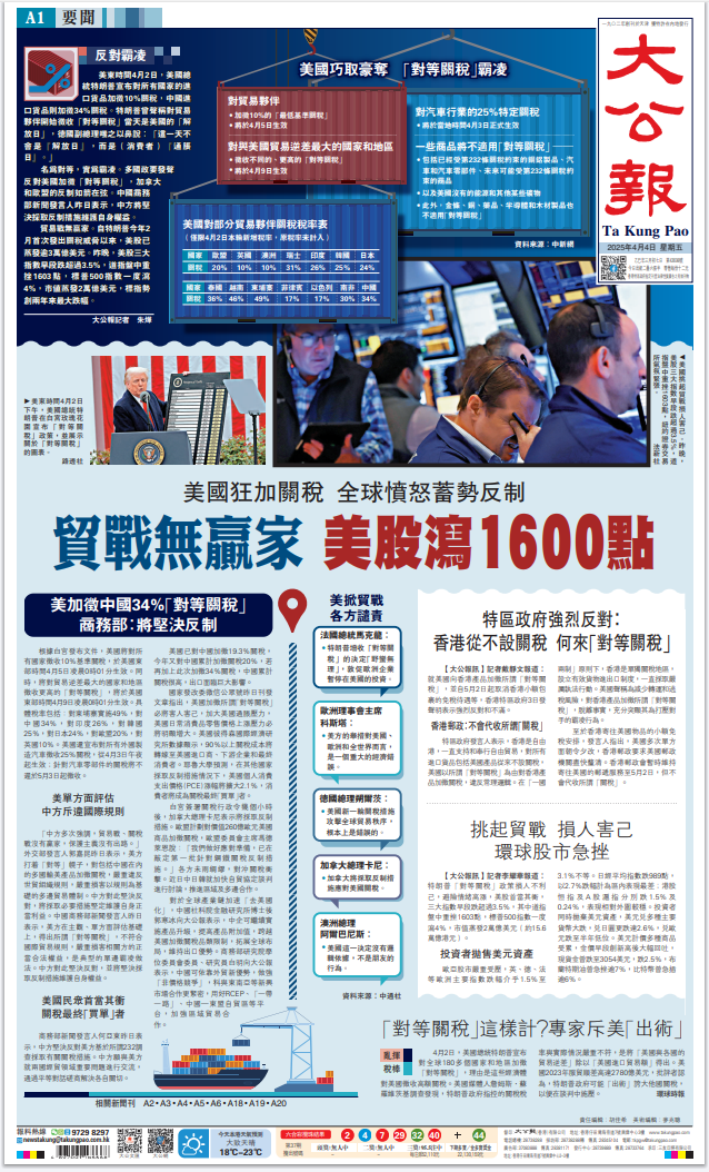 美國(guó)總統(tǒng)特朗普昨日發(fā)動(dòng)史無(wú)前例的關(guān)稅戰(zhàn),向全世界主要國(guó)家徵收巨額關(guān)稅。此舉進(jìn)一步暴露其霸權(quán)主義的真面目,遭到包括其盟友在內(nèi)所有國(guó)家的一致強(qiáng)烈反對(duì)。美股昨晚一度大跌1600點(diǎn),足以體現(xiàn)市場(chǎng)的態(tài)度。面對(duì)美國(guó)的野蠻霸道行徑,中國(guó)將採(cǎi)取必要措施堅(jiān)定維護(hù)自身權(quán)益。對(duì)香港特區(qū)來(lái)說(shuō),挑戰(zhàn)和機(jī)遇並存,既要正視美關(guān)稅戰(zhàn)帶來(lái)的衝擊,更要堅(jiān)定發(fā)展信心,加快融入國(guó)家發(fā)展大局,加大開(kāi)拓新市場(chǎng)的力度,提升應(yīng)對(duì)風(fēng)浪的能力。