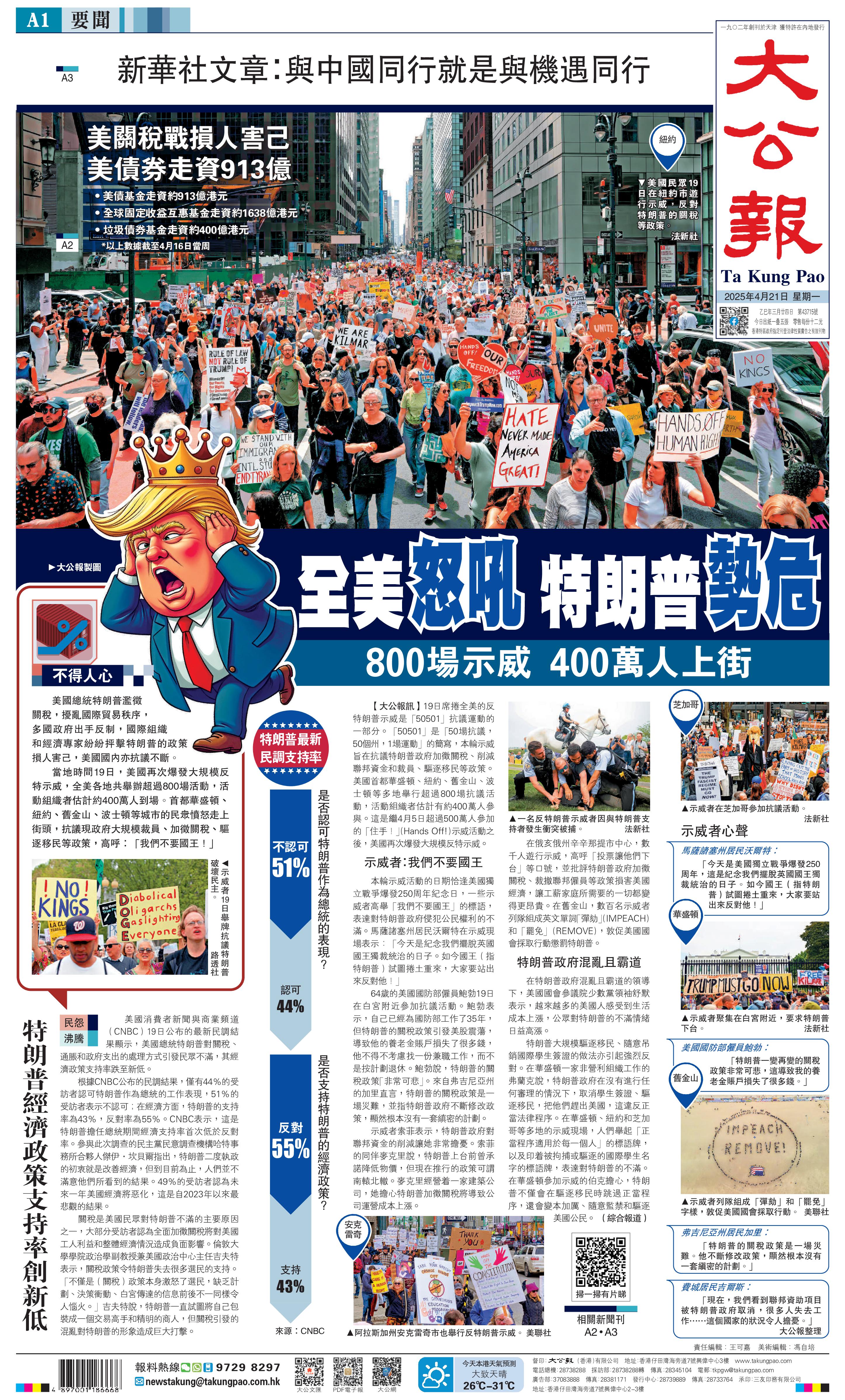 【大公報訊】19日席卷全美的反特朗普示威是「50501」抗議運動的一部分。 「50501」是「50場抗議,50個州,1場運動」的簡寫,本輪示威旨在抗議特朗普政府加征關稅、削減聯邦資金和裁員、驅逐移民等政策。美國首都華盛頓、紐約、舊金山、波士頓等多地舉行超過800場抗議活動,活動組織者估計有約400萬人參與。這是繼4月5日超過500萬人參加的「住手!」(Hands Off!)示威活動之后,美國再次爆發大規模反特示威。