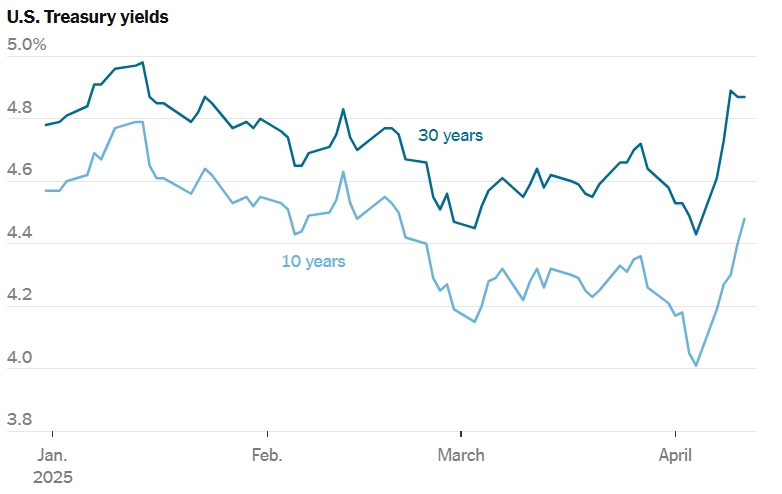 美國《紐約時報》也指出,美國國債以美國政府信用作支撐,長期以來都被視為全球最安全、最穩定的市場之一。然而,美債市場的表現相當異常。因為通常在金融市場不穩定時期,投資者會涌入美債避險,從而推高債券價格,拉低收益率,而近日的實際情況卻恰恰相反。