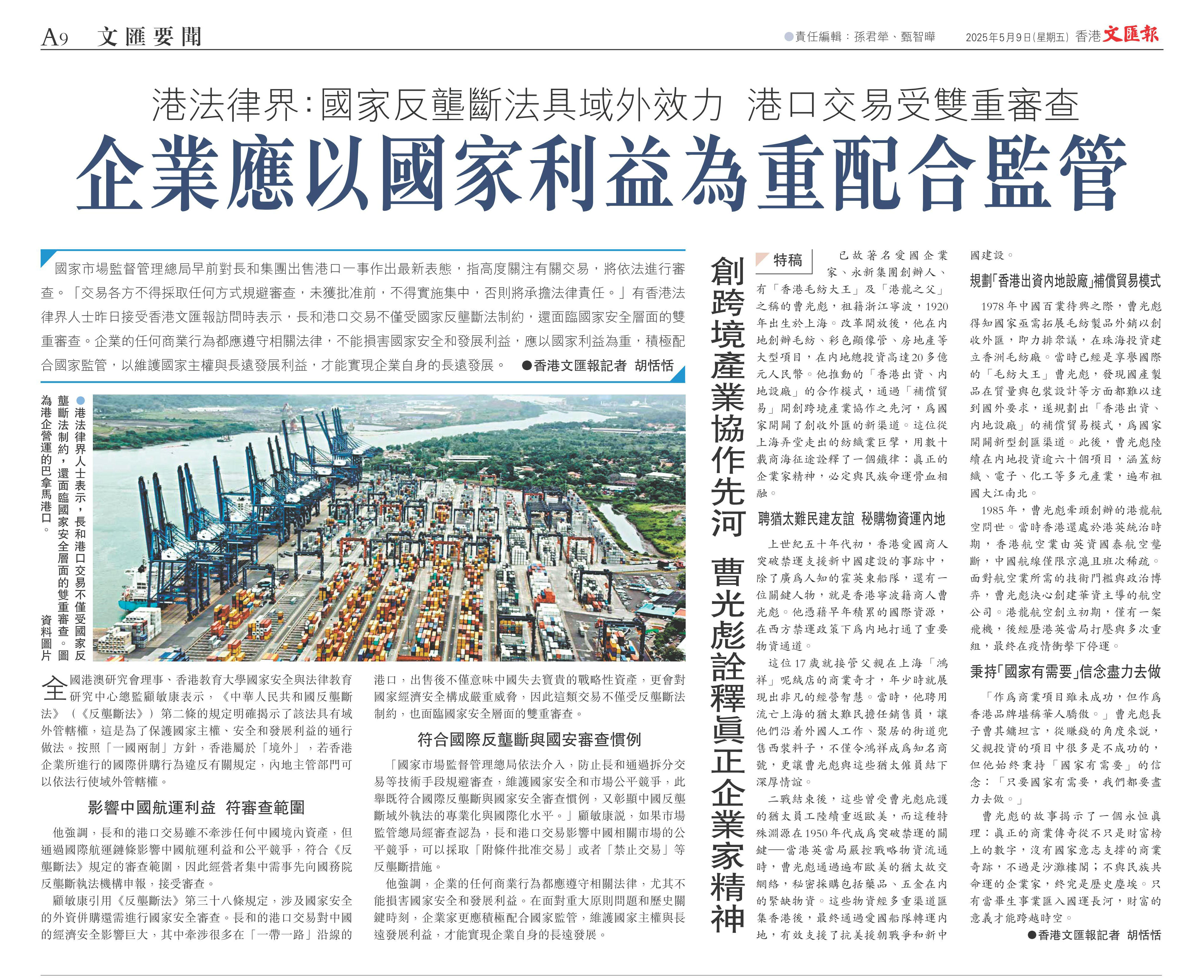 國(guó)家市場(chǎng)監(jiān)督管理總局早前對(duì)長(zhǎng)和集團(tuán)出售港口一事作出最新表態(tài),指高度關(guān)注有關(guān)交易,將依法進(jìn)行審查。 「交易各方不得采取任何方式規(guī)避審查,未獲批準(zhǔn)前,不得實(shí)施集中,否則將承擔(dān)法律責(zé)任。」有香港法律界人士昨日接受香港文匯報(bào)訪問(wèn)時(shí)表示,長(zhǎng)和港口交易不僅受?chē)?guó)家反壟斷法制約,還面臨國(guó)家安全層面的雙重審查。企業(yè)的任何商業(yè)行為都應(yīng)遵守相關(guān)法律,不能損害國(guó)家安全和發(fā)展利益,應(yīng)以國(guó)家利益為重,積極配合國(guó)家監(jiān)管,以維護(hù)國(guó)家主權(quán)與長(zhǎng)遠(yuǎn)發(fā)展利益,才能實(shí)現(xiàn)企業(yè)自身的長(zhǎng)遠(yuǎn)發(fā)展。 ●香港文匯報(bào)記者胡恬恬