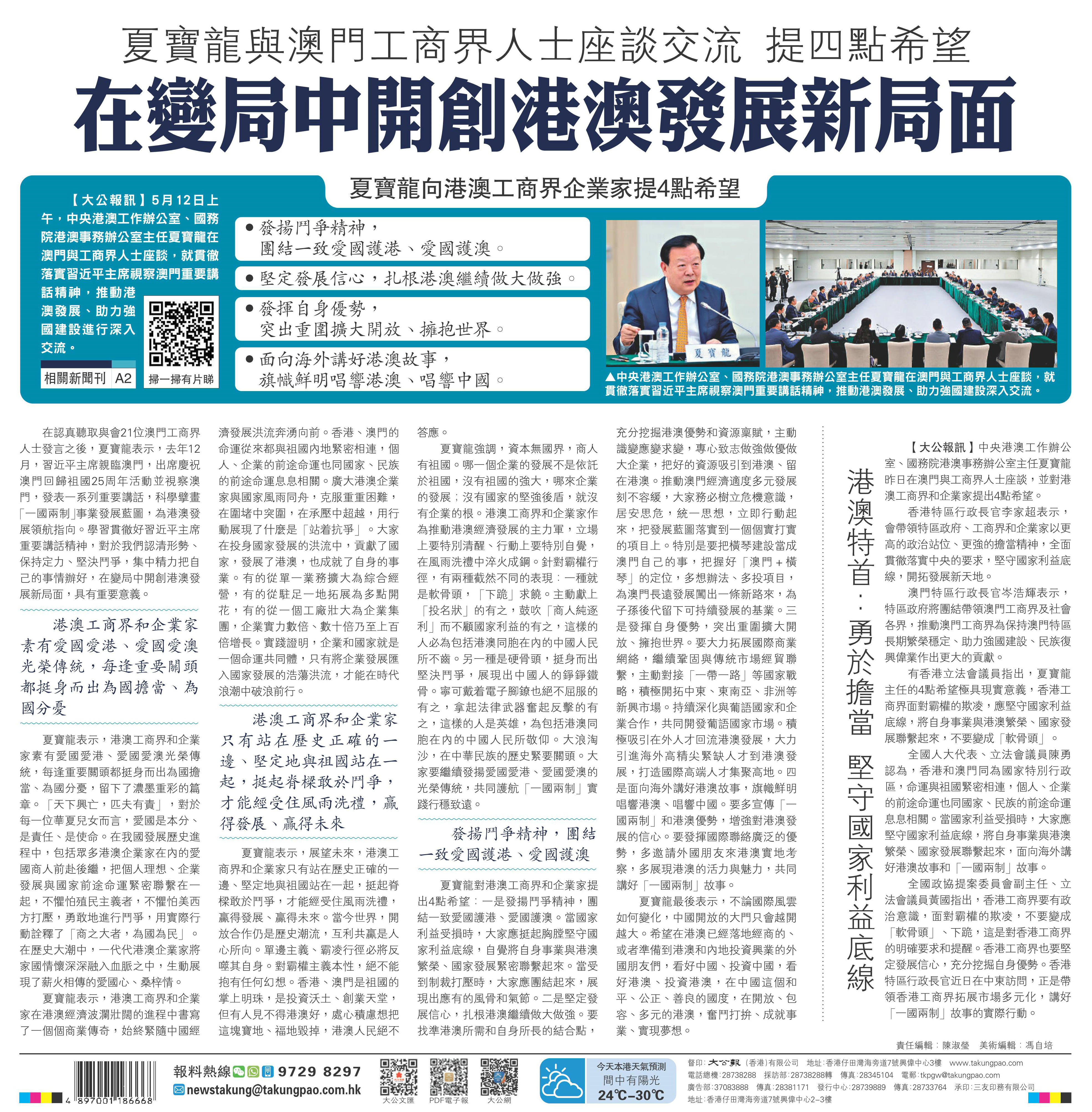 【大公報訊】5月12日上午,中央港澳工作辦公室、國務院港澳事務辦公室主任夏寶龍在澳門與工商界人士座談,就貫徹落實習近平主席視察澳門重要講話精神,推動港澳發展、助力強國建設進行深入交流。