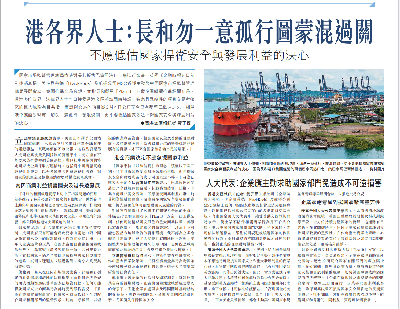 國家市場監督管理總局依法對長和擬售巴拿馬港口一事進行審查。英國《金融時報》日前引述消息稱,美企貝萊德(BlackRock)及航運公司MSC近期主動與中國國家市場監督管理總局展開會談,意圖推進交易合規,并指長和擬用「Plan B」方案企圖繼續推進相關交易。香港多位政界、法律界人士昨日接受香港文匯報訪問時強調,這宗具戰略性的項目交易所帶來的巨大風險有目共睹,而該擬交易的項目從3月4日公布至今已有整整三個月之久,相關港企應面對現實,切勿一意孤行、蒙混過關,更不要低估國家依法捍衛國家安全與發展利益的決心。 ●香港文匯報記者黃子晉