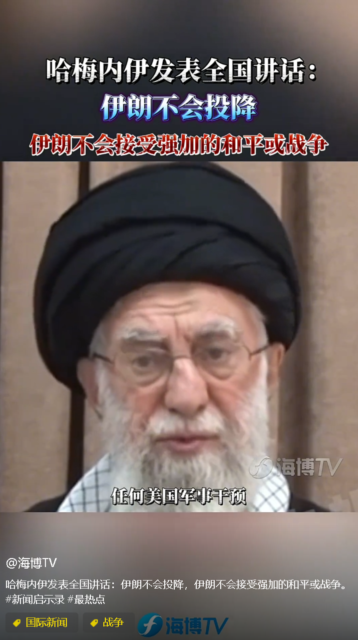 12 哈梅內伊發表全國講話:伊朗不會投降,伊朗不會接受強加的和平或戰爭。