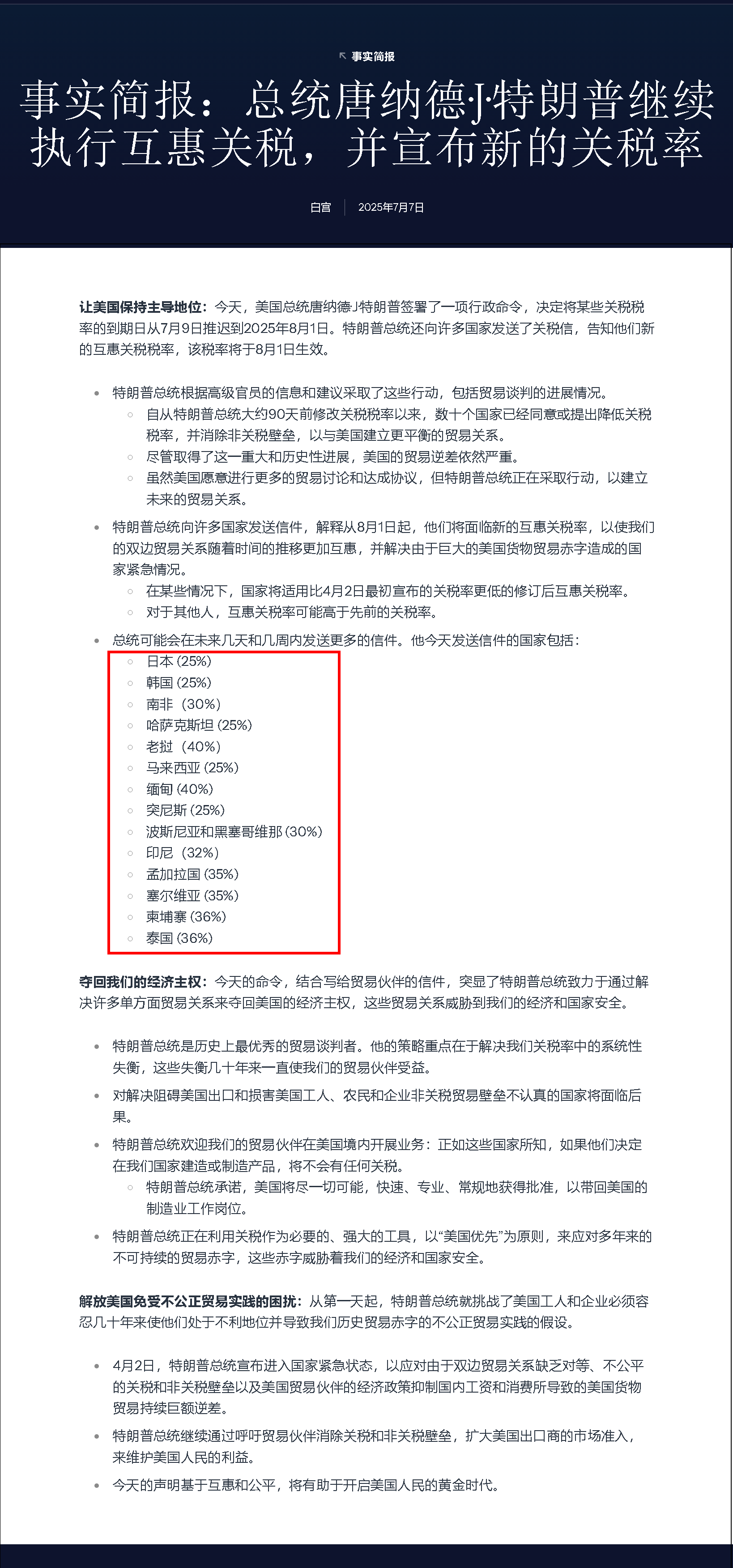 根據這些信的內容,日本、韓國、馬來西亞、突尼斯、哈薩克斯坦將被征收25%的關稅,南非和波黑將被征收30%的關稅,印度尼西亞將被征收32%的關稅,塞爾維亞和孟加拉國將被征收35%的關稅,泰國和柬埔寨將被征收36%的關稅,老撾和緬甸則面臨高達40%的關稅。