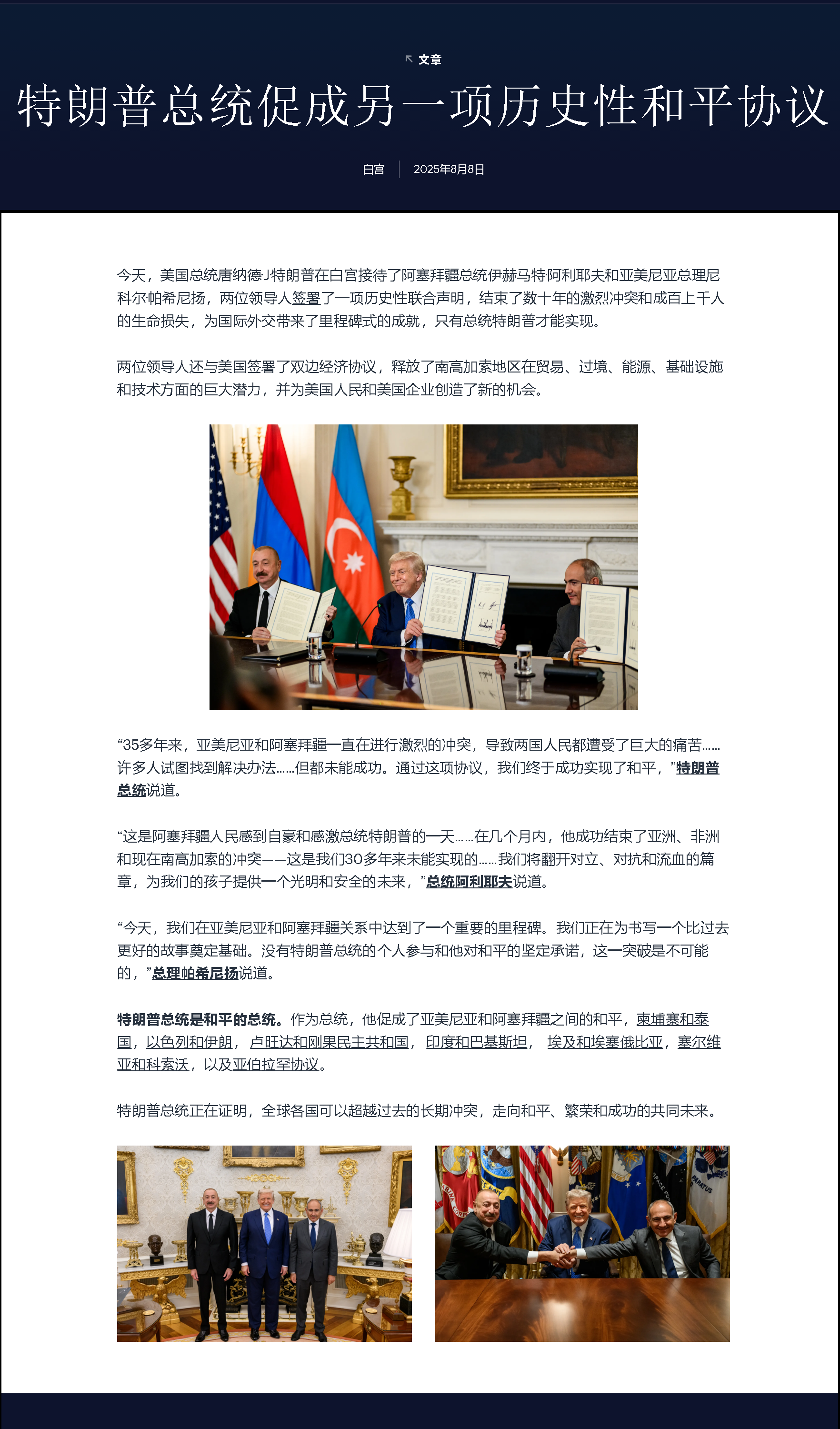 聲明說,阿塞拜疆總統(tǒng)阿利耶夫和亞美尼亞總理帕什尼揚當(dāng)天在美國華盛頓舉行會晤,見證兩國外長草簽上述協(xié)議文本,兩國將采取進一步措施以最終簽署并批準(zhǔn)該協(xié)議。聲明說,歷經(jīng)沖突后,在基于邊界不可侵犯及禁止使用武力奪取領(lǐng)土的原則上,兩國建立睦鄰關(guān)系的條件終于得以創(chuàng)建。這一現(xiàn)實為結(jié)束兩國敵對歷史開辟了道路。