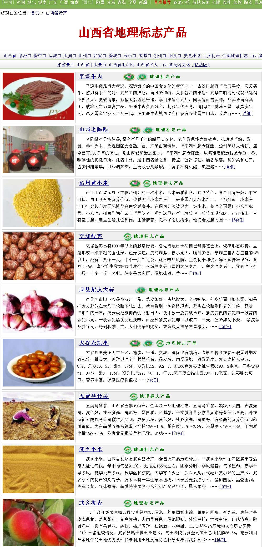 *平遙牛肉 * 山西老陳醋 * 沁州黃小米 * 交城駿棗 * 應(yīng)縣紫皮大蒜 * 太谷壺瓶棗 * 五寨馬鈴薯 * 武鄉(xiāng)小米* 武鄉(xiāng)梅杏 * 代縣大米 * 大寧西瓜 * 王過酥梨 * 壽陽豆腐干 * 澄泥硯 * 平定黃瓜干 *靈丘蕎麥 * 上黨黨參 * 柳林大紅棗 * 太谷餅 * 古縣核桃 * 祁縣酥梨 * 大同黃花 * 晉祠大米* 襄垣手工掛面 * 萬榮蘋果 * 沁水黃小米 * 黎城核桃 * 靈石荊條蜂蜜 * 平遙推光漆器 * 孝義柿子 *左權(quán)綿核桃 * 陽城山茱萸 * 芮城屯屯棗 * 平遙長山藥 * 清徐葡萄 * 靈境莜麥 * 興縣小米 * 運(yùn)城蘋果* 冀村長山藥 * 芮城菊花 * 平遙酥梨 * 賀家莊鮮桃 * 榆次蘋果 * 上黨高粱 * 平順花椒 *平定冠山連翹茶 * 興縣大明綠豆 * 五寨紅蕓豆 * 陽城花椒 * 澤州黃小米 * 涑川茼蒿 * 右衛(wèi)土豆 * 東趙小白梨* 和順肉牛 * 神池胡油 * 忻州香瓜 * 陽城蠶繭 * 懷仁羔羊肉 * 大同小明綠豆 * 沁州核桃 *義井甜瓜 * 永濟(jì)大櫻桃 * 河峪小米 * 右玉羊肉 * 榆社洋槐蜜 * 芮城花椒 * 長子大青椒 * 西回小米* 大寧河雞 * 懷仁陶瓷 * 梧桐山藥 * 隆化小米 * 沁州南瓜子 * 隰縣梨 * 恒山黃芪 *澤州紅山楂 * 壽陽小米 * 長凝大蒜 * 汾州核桃 * 稷山板棗 * 官灘棗 * 平魯紅山蕎麥 * 永濟(jì)蘆筍* 萬榮大黃牛 * 洪洞蓮藕 * 熬腦大蔥 * 絳縣山楂 * 壺關(guān)黨參 * 榆社笨雞蛋 * 襄陵蓮藕 *孝義核桃 * 左云苦蕎 * 廣靈大尾羊 * 廣靈小米 * 鄉(xiāng)寧翅果 * 洪井三皇小米 * 嵐縣馬鈴薯 * 長治堆錦* 沁水黑木耳 * 柏籽羊肉 * 清徐老陳醋 * 臨縣紅棗 * 萬泉大蔥 * 臨猗蘋果 * 陽高長城羊肉 *平定荊花蜂蜜 * 潞州黃芩 * 上黨連翹 * 聞喜宰相花饃 * 代縣酥梨 * 芮城蘆筍 * 聞喜蓮藕 * 絳縣大櫻桃* 連伯韭菜 * 泗交黑木耳 * 仙人紅薯 * 神池黑豆 * 神池黍子 * 沁水黑山羊 * 巴公大蔥 *神池胡麻 * 應(yīng)縣陶瓷 * 汾西梨 * 靈丘大青背山羊 * 原平紫皮大蒜 * 隰縣玉露香梨 * 平定砂器 * 晉城荊條花蜂蜜* 曲沃麥茬羊肉 * 廣靈苦蕎 * 廣靈大尾羊羊肉 * 北董大蒜 * 清徐沙金紅杏 * 霍州核桃 * 沁水刺槐蜂蜜 *平陸蘋果 * 天鎮(zhèn)唐杏 * 應(yīng)縣胡蘿卜 * 偏關(guān)羊肉 * 偏關(guān)小米 * 涔山芥菜 * 寧武莜麥 * 神池羊肉* 定襄甜瓜 * 霍州蘋果 * 斗山杏仁 * 析城山小米 * 汾陽釀酒高粱 * 吉縣蘋果 * 應(yīng)縣青椒 *永和條棗 * 岢嵐紅蕓豆 * 大寧紅皮小米 * 繁峙黃米 * 高平大黃梨 * 神池莜麥 * 北景柿子 * 芮城蘋果* 臨晉江石榴 * 南林交蓮藕 * 陽曲小米 * 蒲縣核桃 * 平順潞黨參 * 陵川黑山羊 * 孫家灣香椿 *趙康辣椒 * 杜馬百合 * 陽城桑葚 * 安澤連翹 * 戎子酒莊葡萄酒 * 交城梨棗 * 壺關(guān)旱地西紅柿 * 萬榮三白瓜* 運(yùn)城鹽池黑泥 * 蒲縣馬鈴薯 * 廣靈畫眉驢 * 七里坡山楂 * 岢嵐柏籽羊肉 * 忻州糯玉米 * 臨縣開陽大棗 *吳王渡黃河鱉 * 運(yùn)城鹽池大鹽 * 杏花村酒 * 竹葉青酒 *