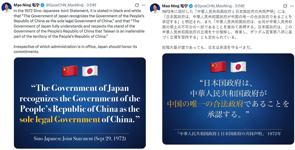 11月16日,中國外交部發言人毛寧在X網站用英語、日語雙語發布2組共4張海報,援引1972年《中日聯合聲明》中涉臺內容,提醒日方:“無論誰當政,日本都必須信守承諾”。
