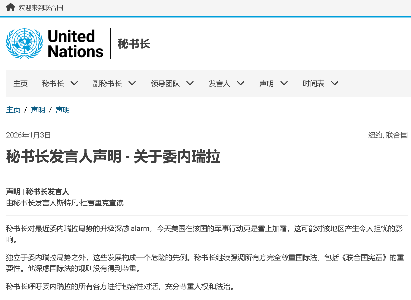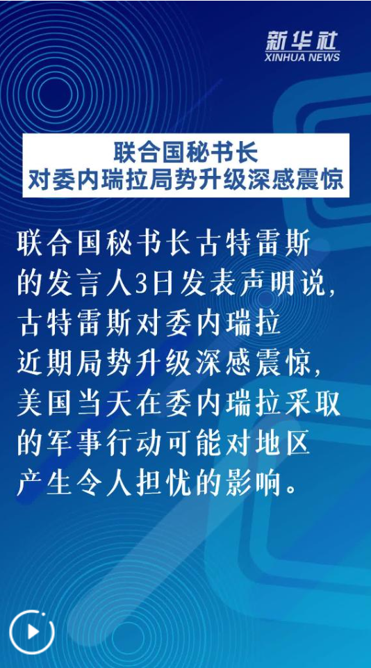 新華社聯(lián)合國1月3日電 聯(lián)合國秘書長古特雷斯的發(fā)言人3日發(fā)表聲明說,古特雷斯對委內(nèi)瑞拉近期局勢升級深感震驚,美國當(dāng)天在委內(nèi)瑞拉采取的軍事行動可能對地區(qū)產(chǎn)生令人擔(dān)憂的影響。