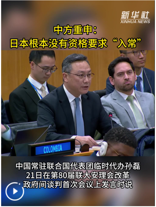 新華社聯合國1月21日電 中國常駐聯合國代表團臨時代辦孫磊21日在第80屆聯大安理會改革政府間談判首次會議上發言時說,日本無法承擔維護國際和平與安全的職責,無法取信于國際社會,根本沒有資格要求成為安理會常任理事國。
