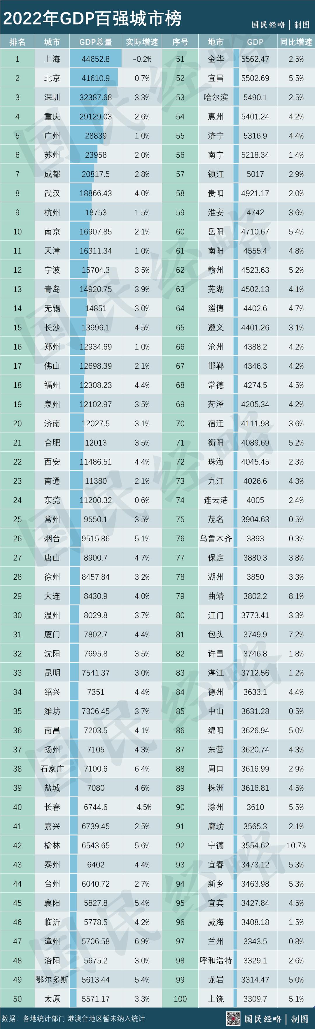2022年GDP百強城市榜單近日出爐。受到疫情等超預期因素沖擊,過去一年中百強城市大洗牌,36座城市排名下降。以5571.17億元的GDP總量,我市排在第50位,位次保持不變。