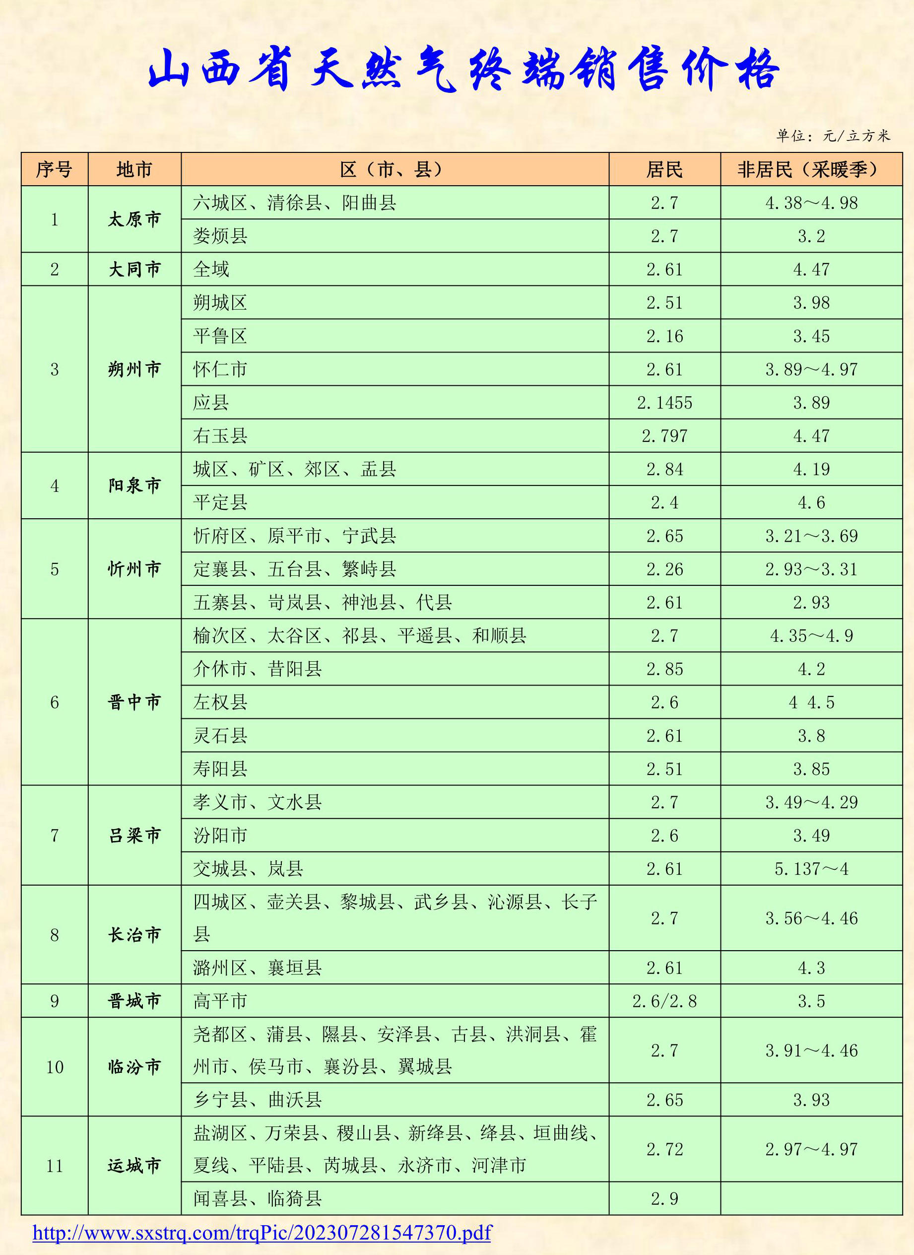 第一檔2.61元/立方米,第二檔2.83元/立方米,第三檔4.23元/立方米,執行居民價格的非居民戶2.63元/立方米。非居民發電用氣2.27元/立方米,供暖、制冷用氣是城六區2.45元/立方米,其他區域:2.21元/立方米;工商業用氣是城六區:2.87元/立方米,其他區域:2.63元/立方米;壓縮天然氣加氣母站(供非居民用)是2.33元/立方米。