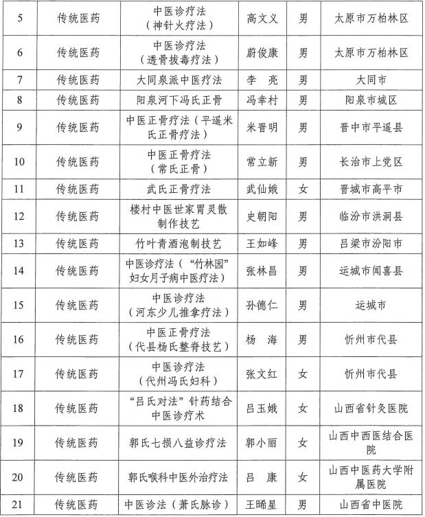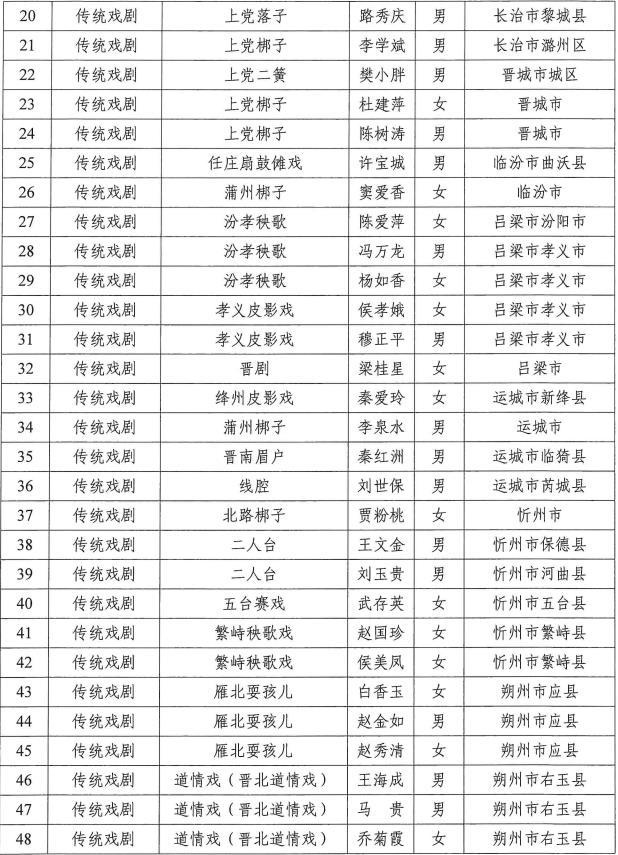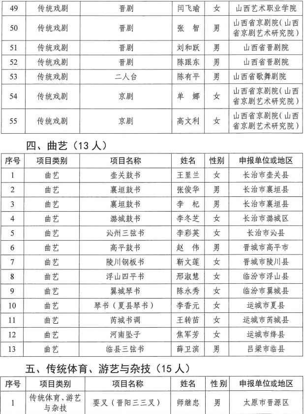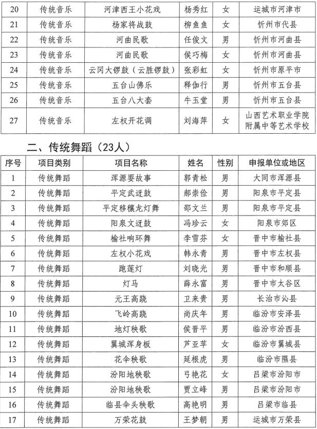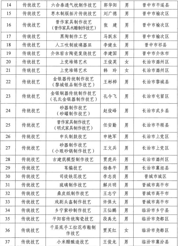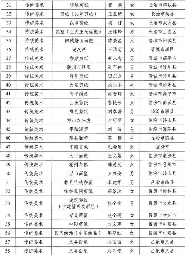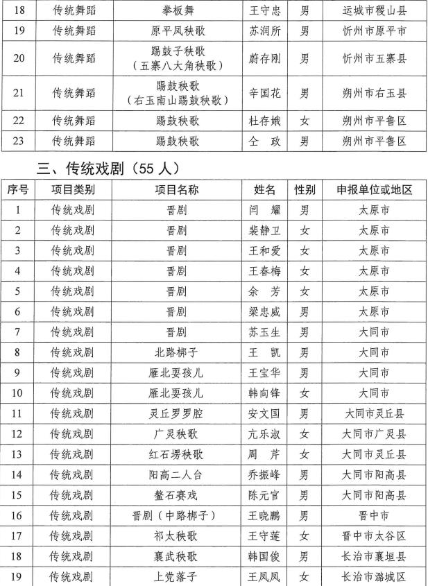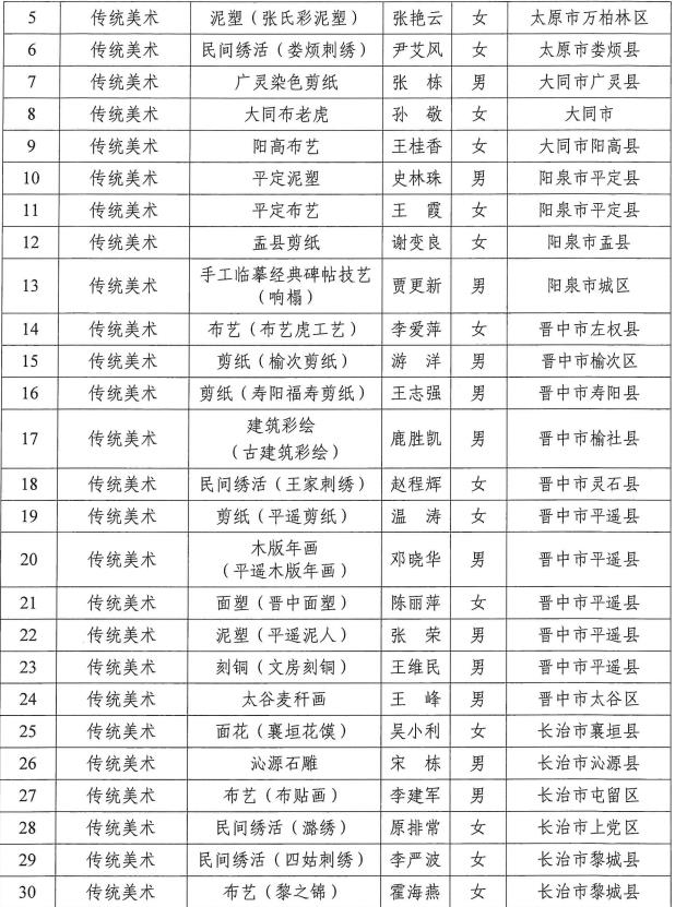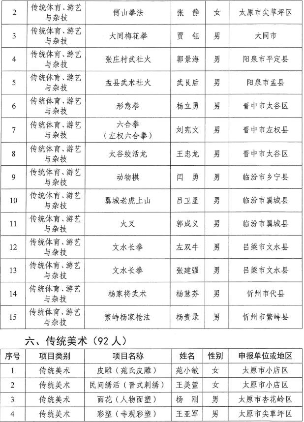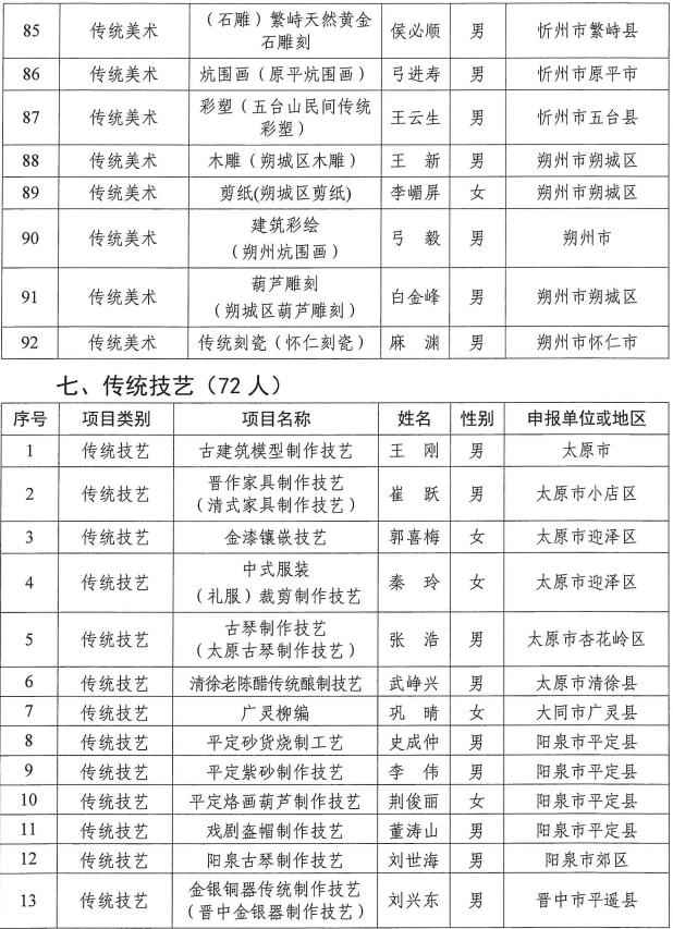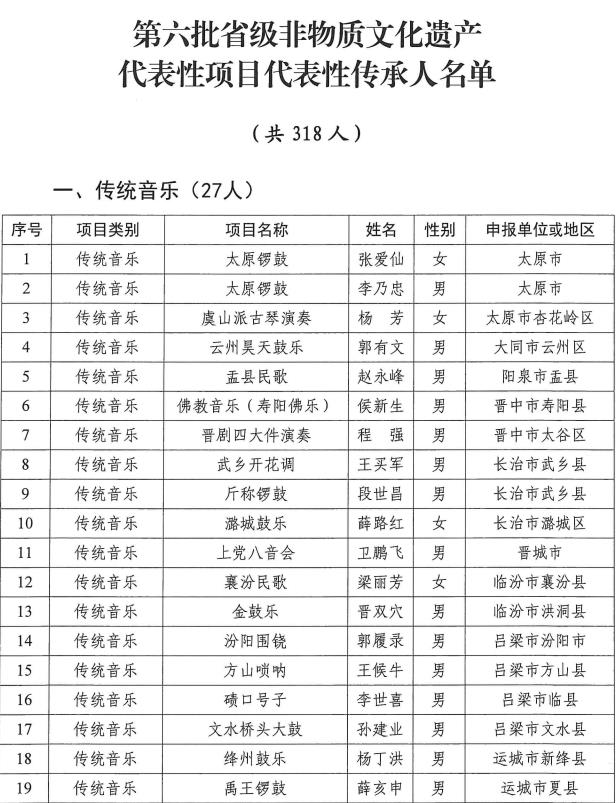 進入第六批省級非物質文化遺產代表性項目代表性傳承人名單的傳承人共318名,其中,傳統音樂類包括太原鑼鼓張愛仙、上黨八音會衛鵬飛等27人,傳統舞蹈類包括渾源耍故事郭青松、左權小花戲韓永青等23人,傳統戲劇類包括晉劇閆耀、靈丘羅羅腔安文國等55人,曲藝類包括壺關鼓書王里蘭、陵川鋼板書靳文蓮等13人,傳統體育、游藝與雜技類包括大同梅花拳賈鈺、文水長拳左雙牛等15人,傳統美術類包括廣靈染色剪紙張棟。平遙木版年畫鄧曉華等92人,傳統技藝類包括晉作家具制作技藝崔躍、平定紫砂制作技藝李偉等72人,傳統醫藥類包括太原楊氏形意正骨術楊中江、大同泉派中醫療法李亮等21人。