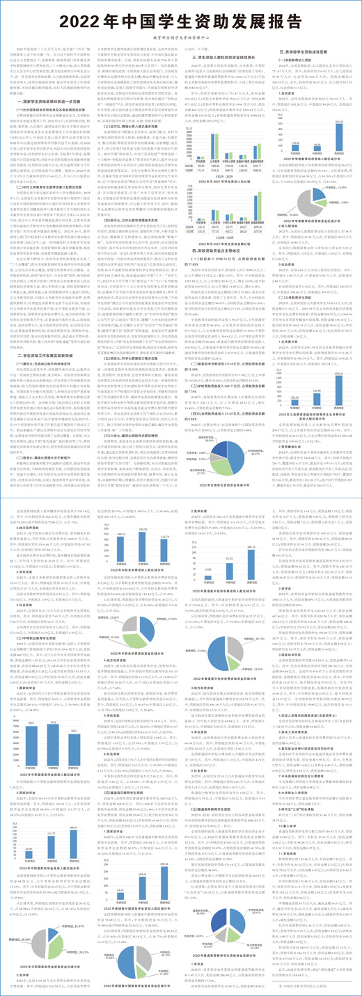 2022年是黨的二十大召開之年,是實施“十四五”規劃綱要承上啟下的關鍵一年。在習近平新時代中國特色社會主義思想指引下,各級教育、財政等部門和各級各類學校緊緊圍繞學習貫徹黨的二十大精神主線,深入貫徹落實以人民為中心的發展思想,著力促進教育公平和社會公平,進一步完善學生資助政策,大力推進精準資助,全面深化資助育人,持續加強規范管理,推動學生資助工作高質量發展,為加快建設教育強國、辦好人民滿意的教育作出積極貢獻。