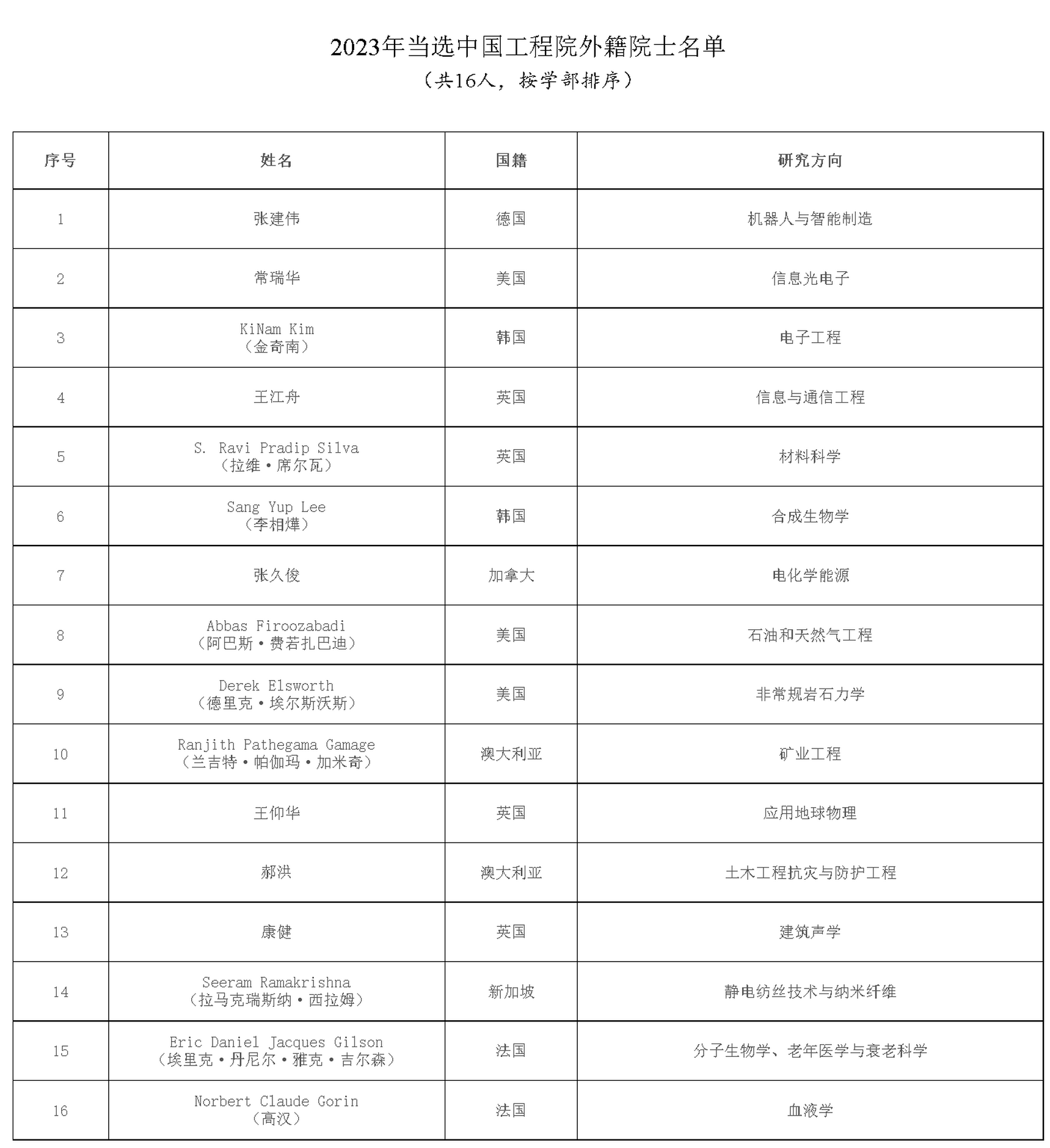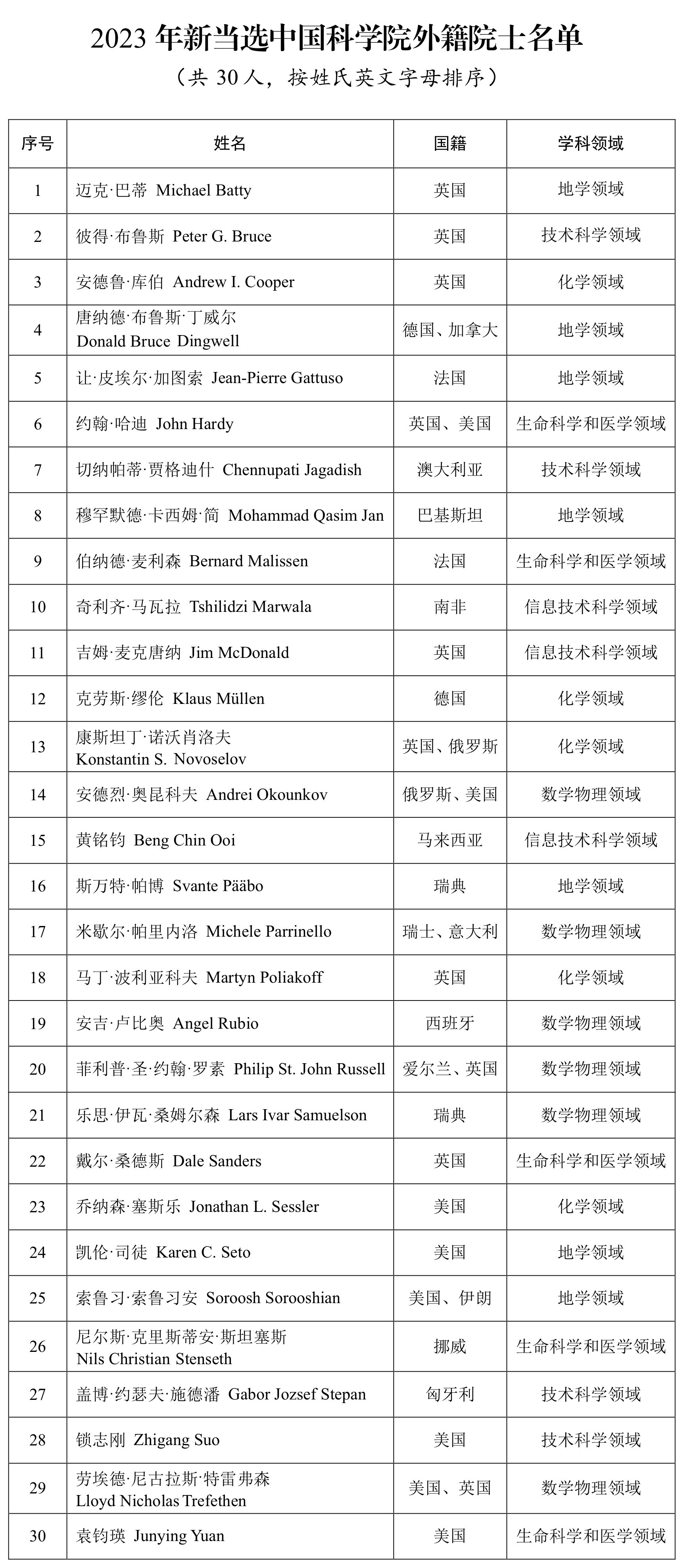 新華社北京11月23日電(記者張泉)中國科學(xué)院、中國工程院23日公布了2023年當(dāng)選外籍院士名單,分別選舉產(chǎn)生30位中國科學(xué)院外籍院士、16位中國工程院外籍院士。