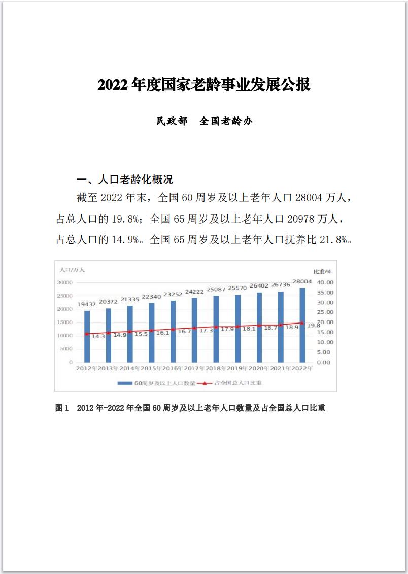 民政部公布《2022年度國家老齡事業發展公報》,截至2022年末,全國60周歲及以上老年人口28004萬人,占總人口的19.8%;全國65周歲及以上老年人口20978萬人,占總人口的14.9%。全國65周歲及以上老年人口撫養比21.8%。