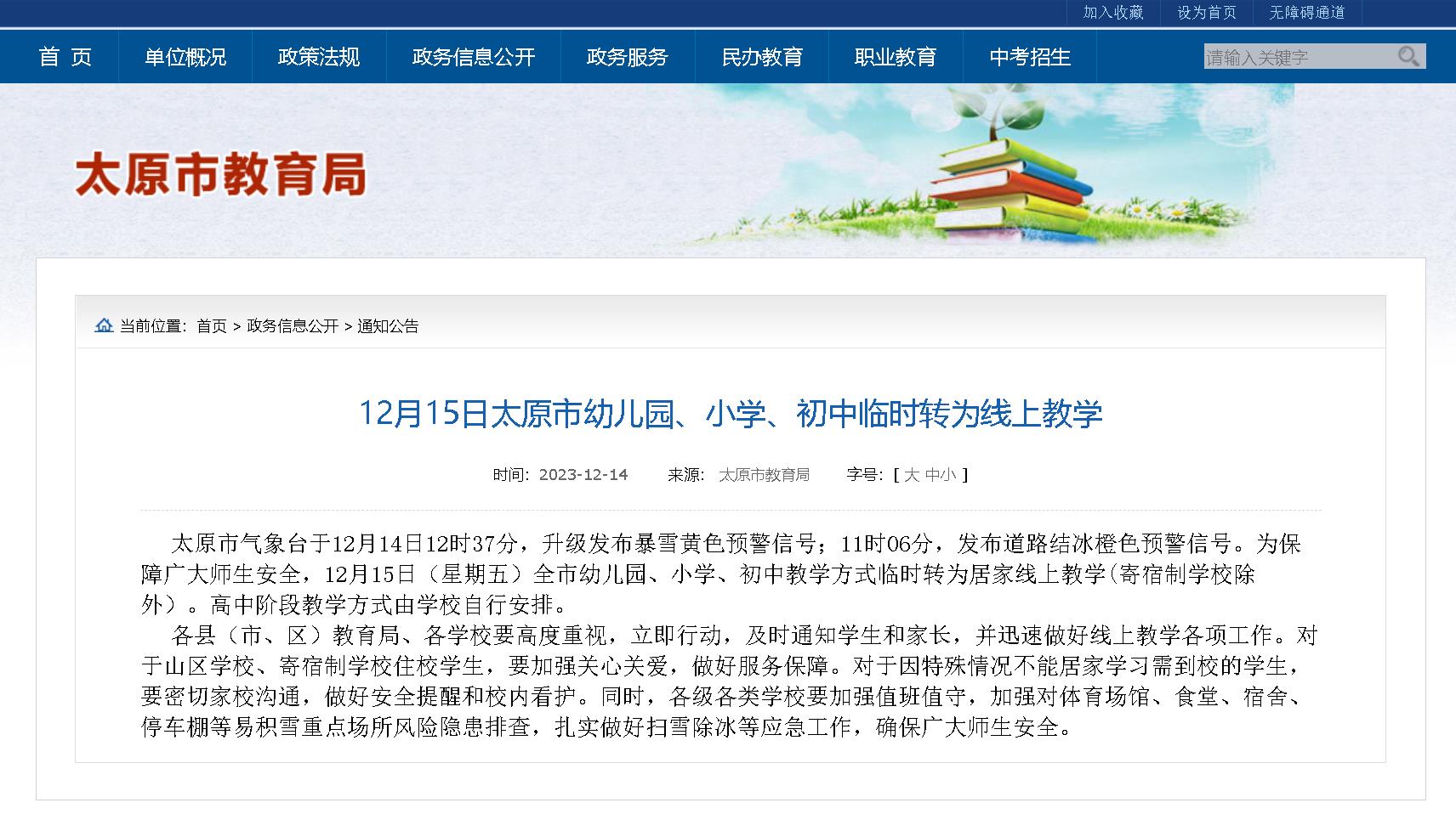 太原市氣象臺于12月14日12時37分,升級發布暴雪黃色預警信號;11時06分,發布道路結冰橙色預警信號。為保障廣大師生安全,太原市教育局發布:12月15日(星期五)太原市幼兒園、小學、初中教學方式臨時轉為居家線上教學。高中階段教學方式由學校自行安排。