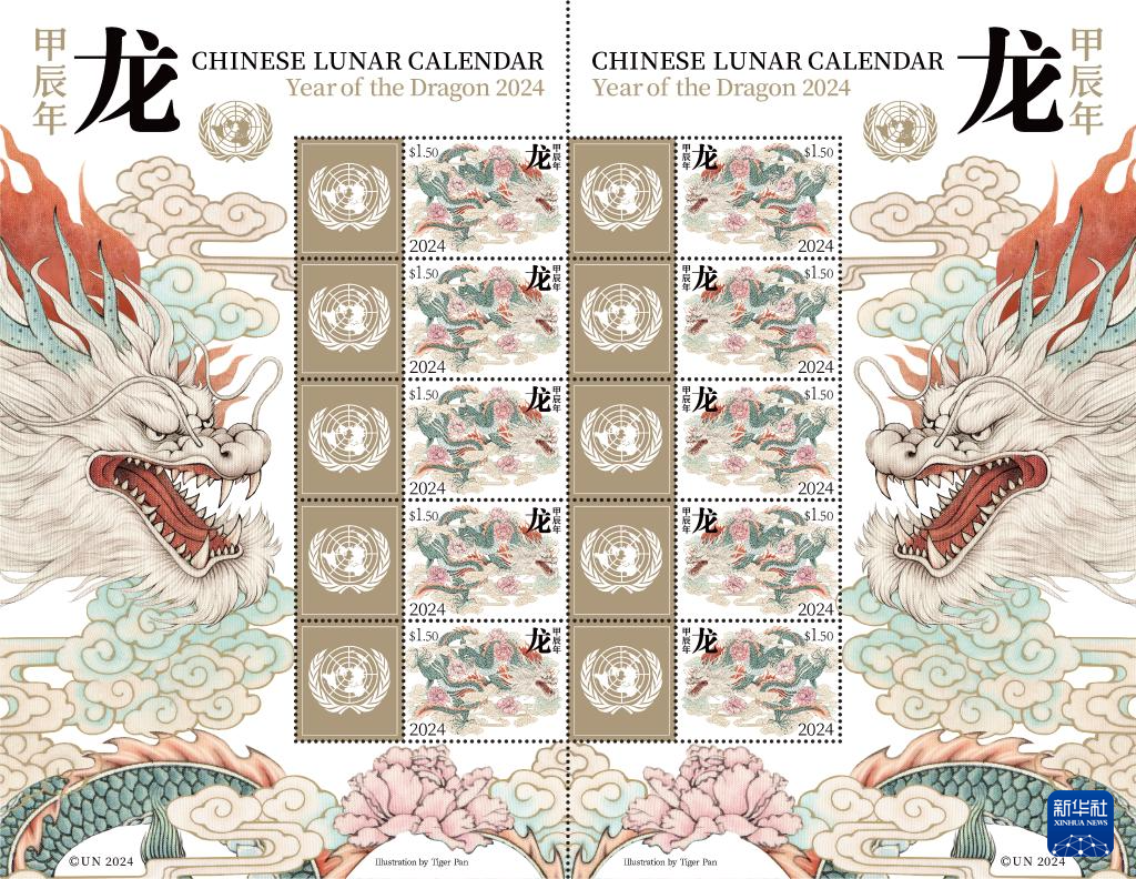 聯(lián)合國郵政管理局將于1月19日在紐約發(fā)行中國農(nóng)歷甲辰年特別版郵票版張——龍票版張,慶祝中國農(nóng)歷新年的到來。這是該郵票版張樣圖。新華社發(fā)(聯(lián)合國郵政管理局供圖)
