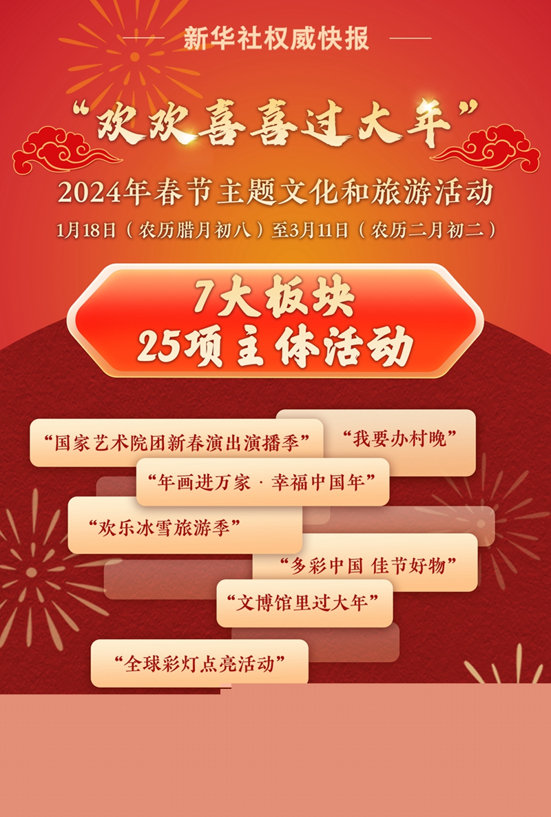 1月18日,文化和旅游部舉行媒體推介會,發布“歡歡喜喜過大年”2024年春節主題文化和旅游活動。活動于1月18日(農歷臘月初八)至3月11日(農歷二月初二)開展,包含7大板塊共計25項主體活動。