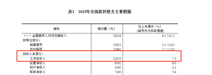 按收入來源分,2023年,全國居民人均工資性收入22053元,增長7.1%,占可支配收入的比重為56.23%。