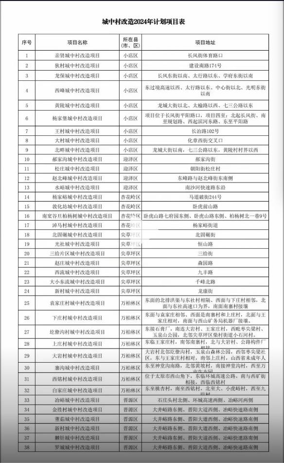 4月9日,一張關(guān)于《城中村改造2024年計(jì)劃項(xiàng)目表》不脛而走。其中包含了親賢村、狄村、龍保村、西峰村等38個(gè)城改項(xiàng)目,囊括了小店區(qū)、迎澤區(qū)、杏花嶺區(qū)、尖草坪區(qū)、萬(wàn)柏林區(qū)和晉源區(qū)六大主城區(qū)。