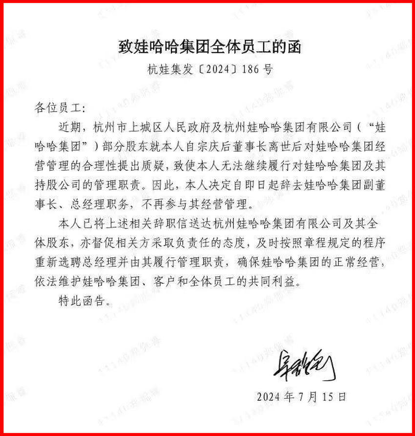 娃哈哈老掌門人去世僅僅141天,新掌門人函告辭職,是真是假還是另有隱情?