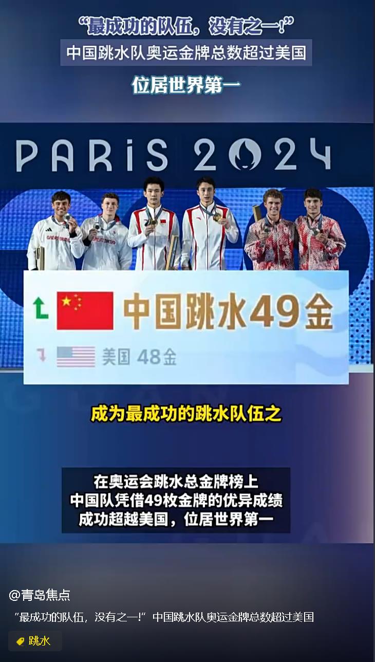 [中國跳水奧運金牌總數已超美國 轉發!為中國健兒發條微博!] 今天,在奧運會跳水總金牌榜上,中國跳水隊已獲49枚金牌,正式超越美國隊的48枚金牌。贊中國隊!
