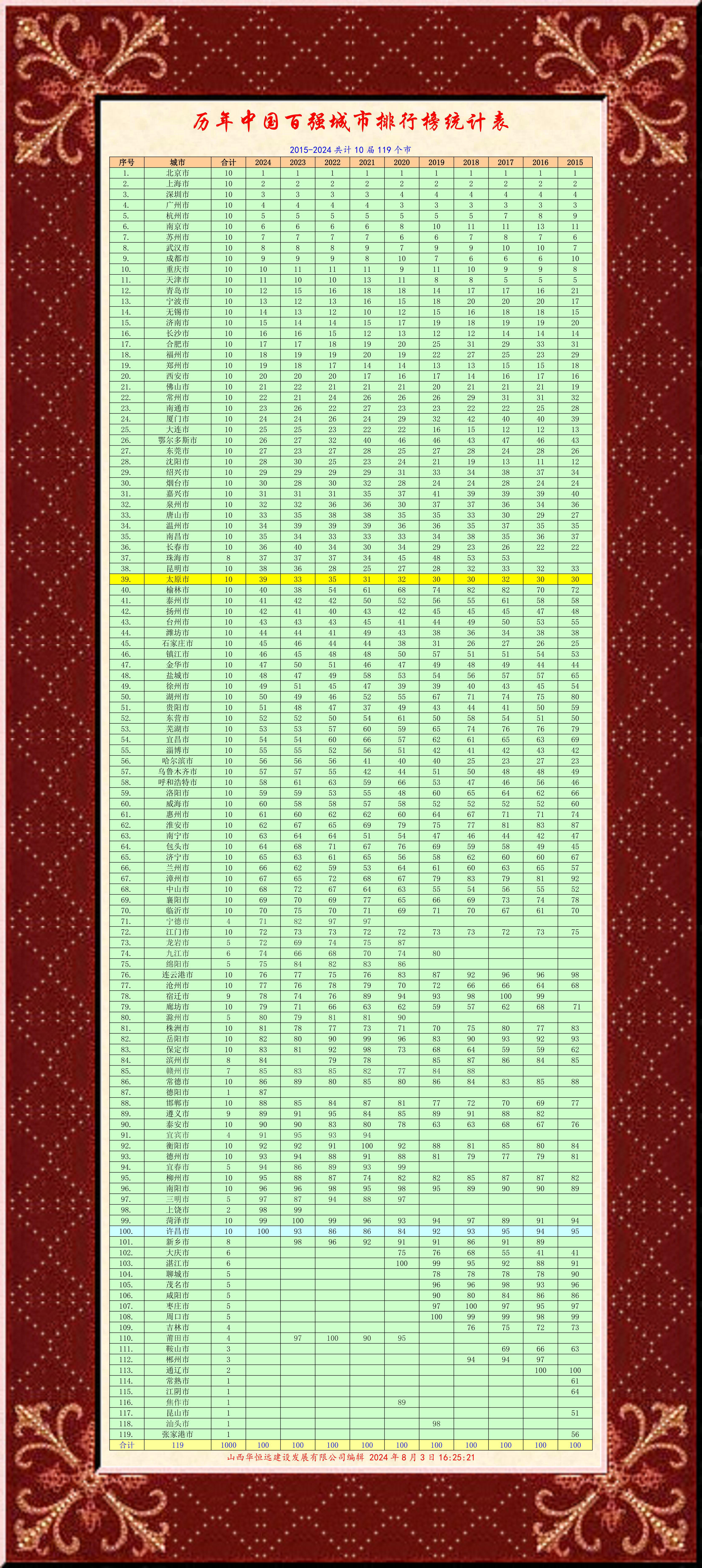 排名 城市 合計 2024 2023 2022 2021 2020 2019 2018 2017 2016 2015