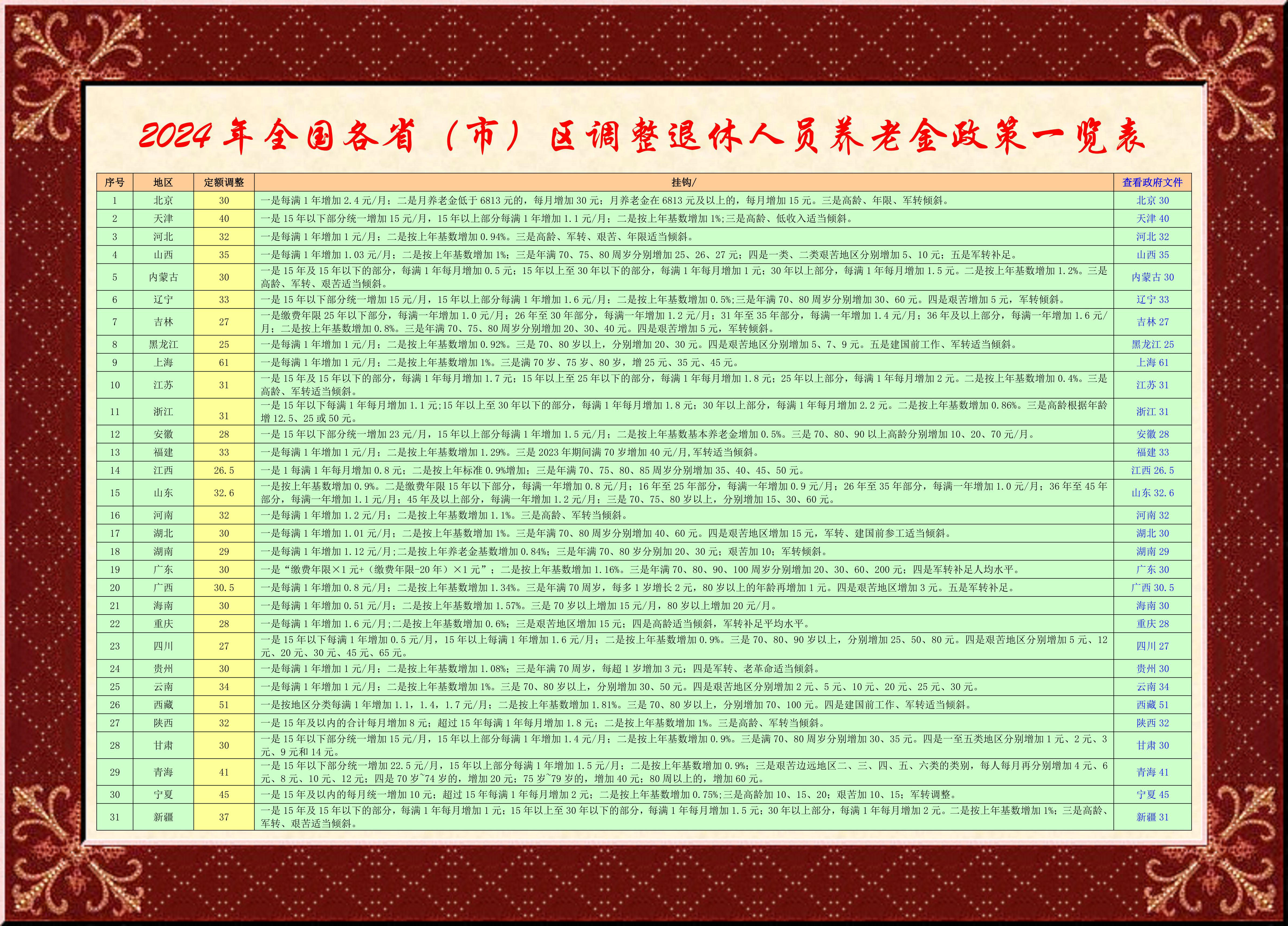 2024年全國31個?。ㄊ校┳灾螀^退休人員調整基本養老金已經落實到位,一年一度1.4億退休人員得到了實實在在的實惠,這是黨中央和各級人民政府把人民生活放在第一位的偉大功績,可圈可點,令人欣慰!