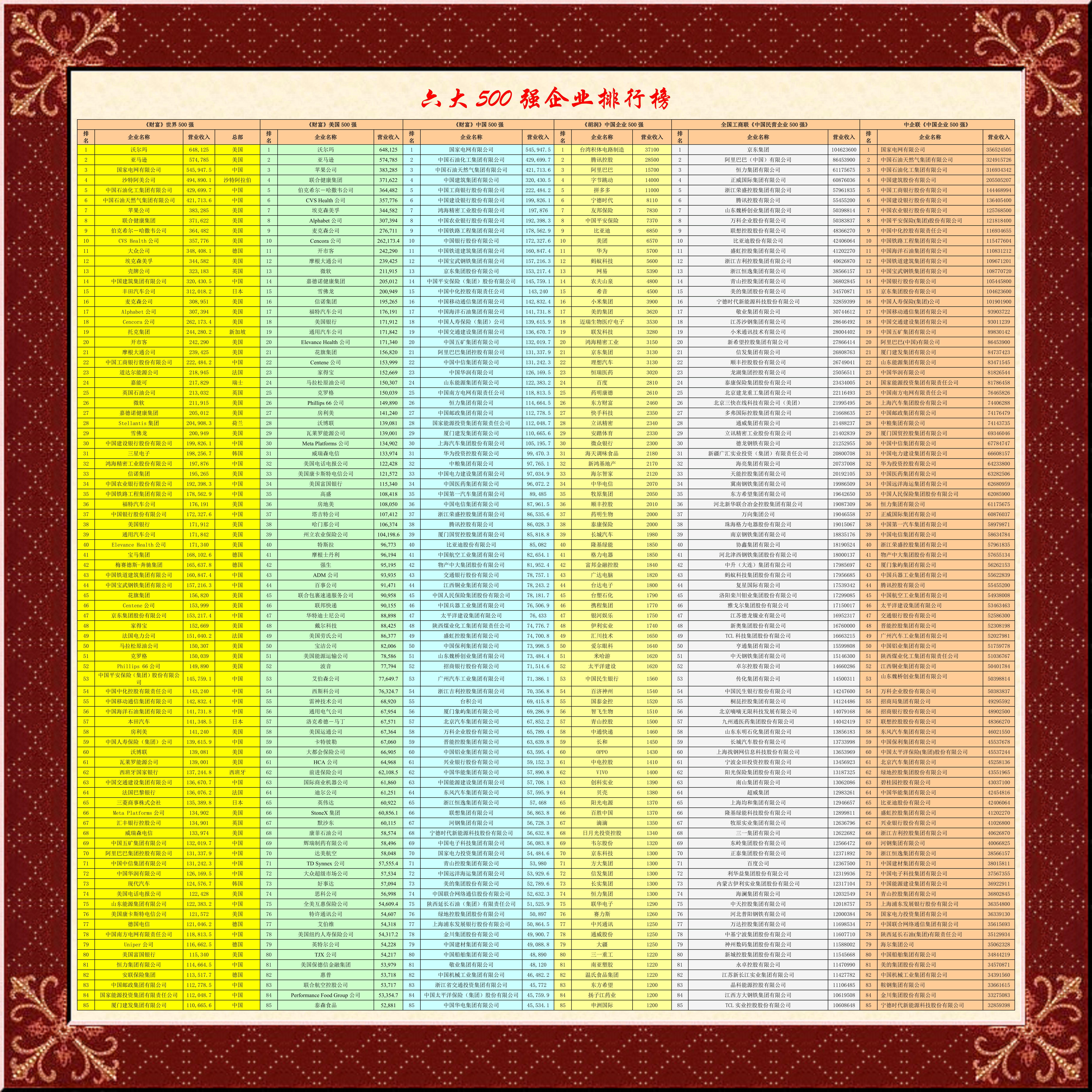 《財富》世界500強、美國500強、中國500強,胡潤《中國500強》,中企聯《中國企業500強》和全國工商聯《中國民營企業500強》六大榜單,我們縱橫比較一下,看看高低差距。