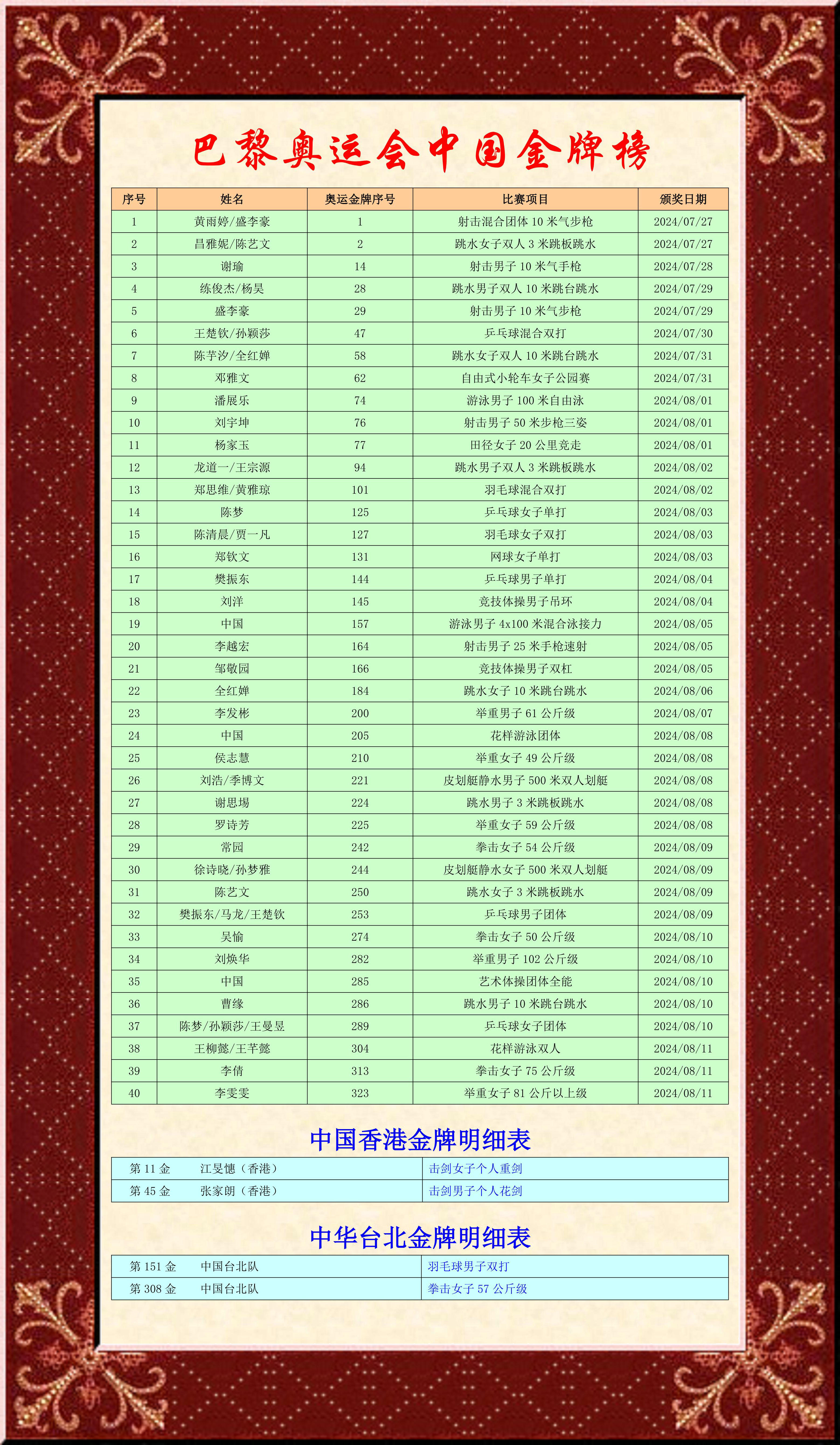 我這個體育外行,卻對獎牌榜情有獨鐘,特別是金牌究竟多少?都是誰家拿走的?一定要弄個清清楚楚明明白白,做事情就是要有這種精神這種思維這種行動,才能把事情做好,你說是不是?!