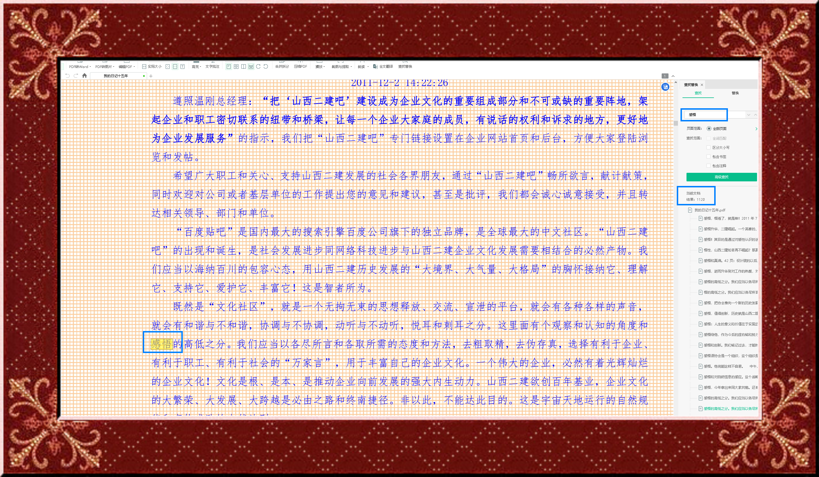 十五年日記統計,“感悟”1120處。這是山西二建從2011年開始走出困境的思想解放,獲得戰略突破奠定了感悟的思想基礎!