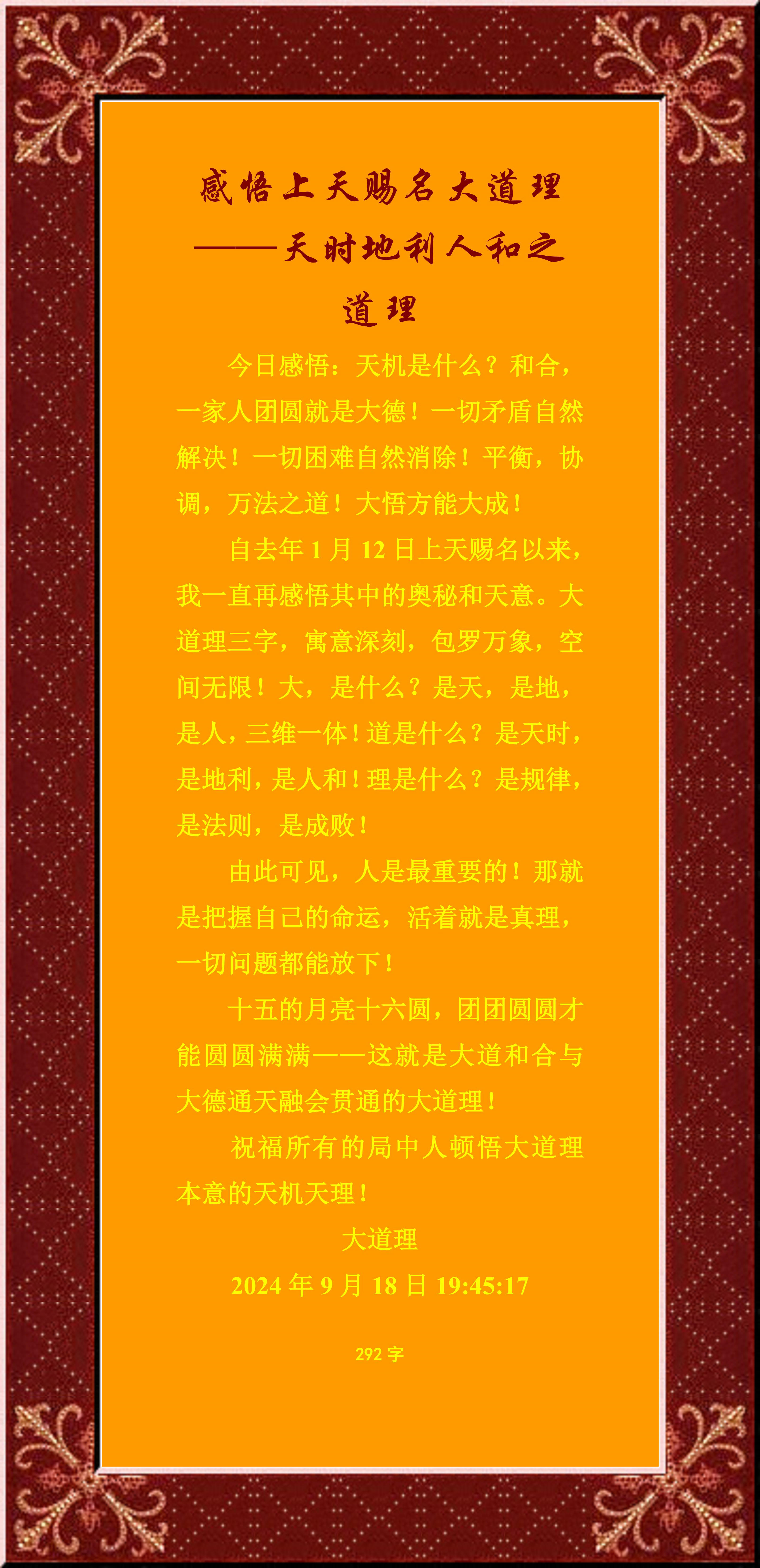 今日感悟:天機是什么?和合,一家人團圓就是大德!一切矛盾自然解決!一切困難自然消除!平衡,協調,萬法之道!大悟方能大成!
