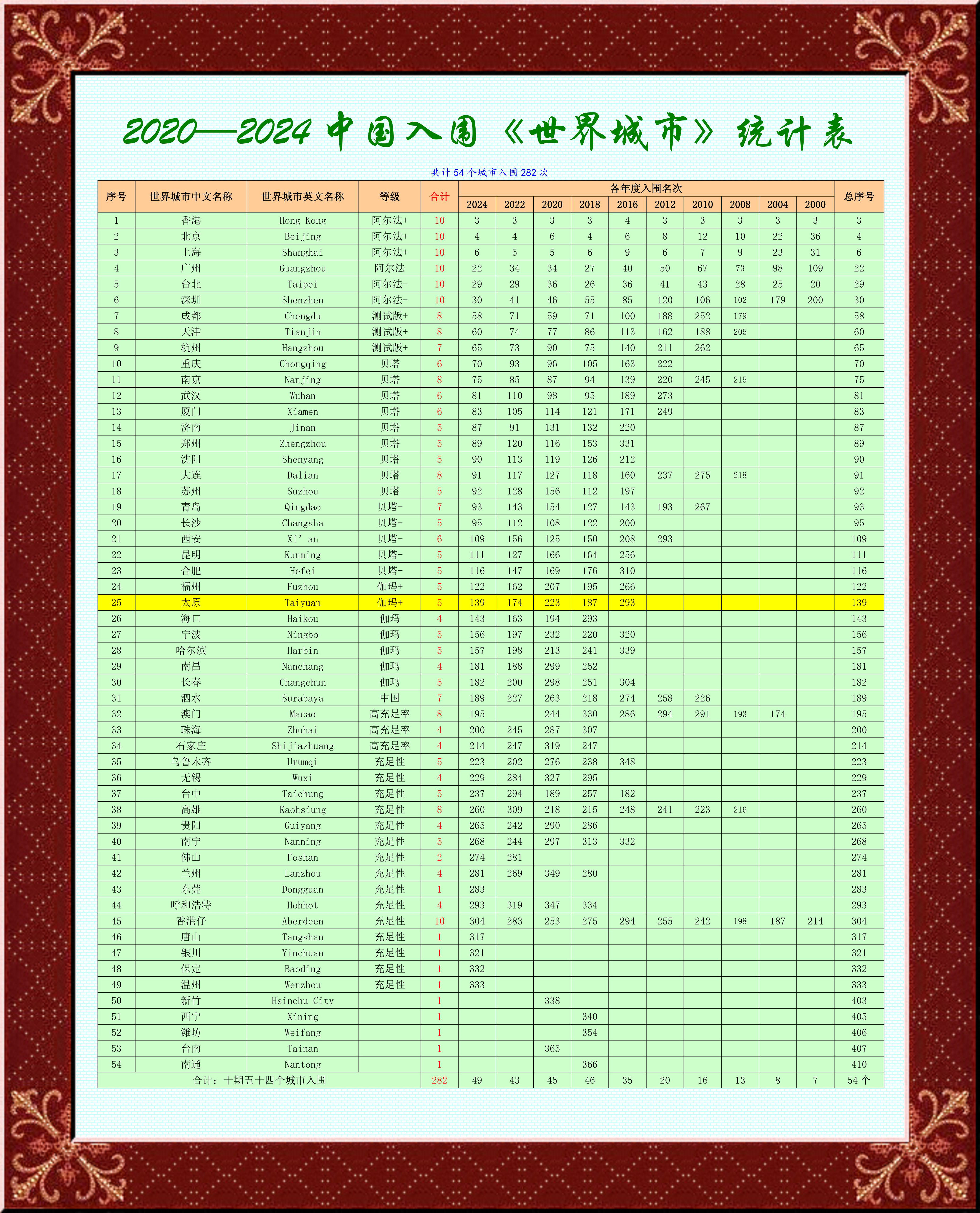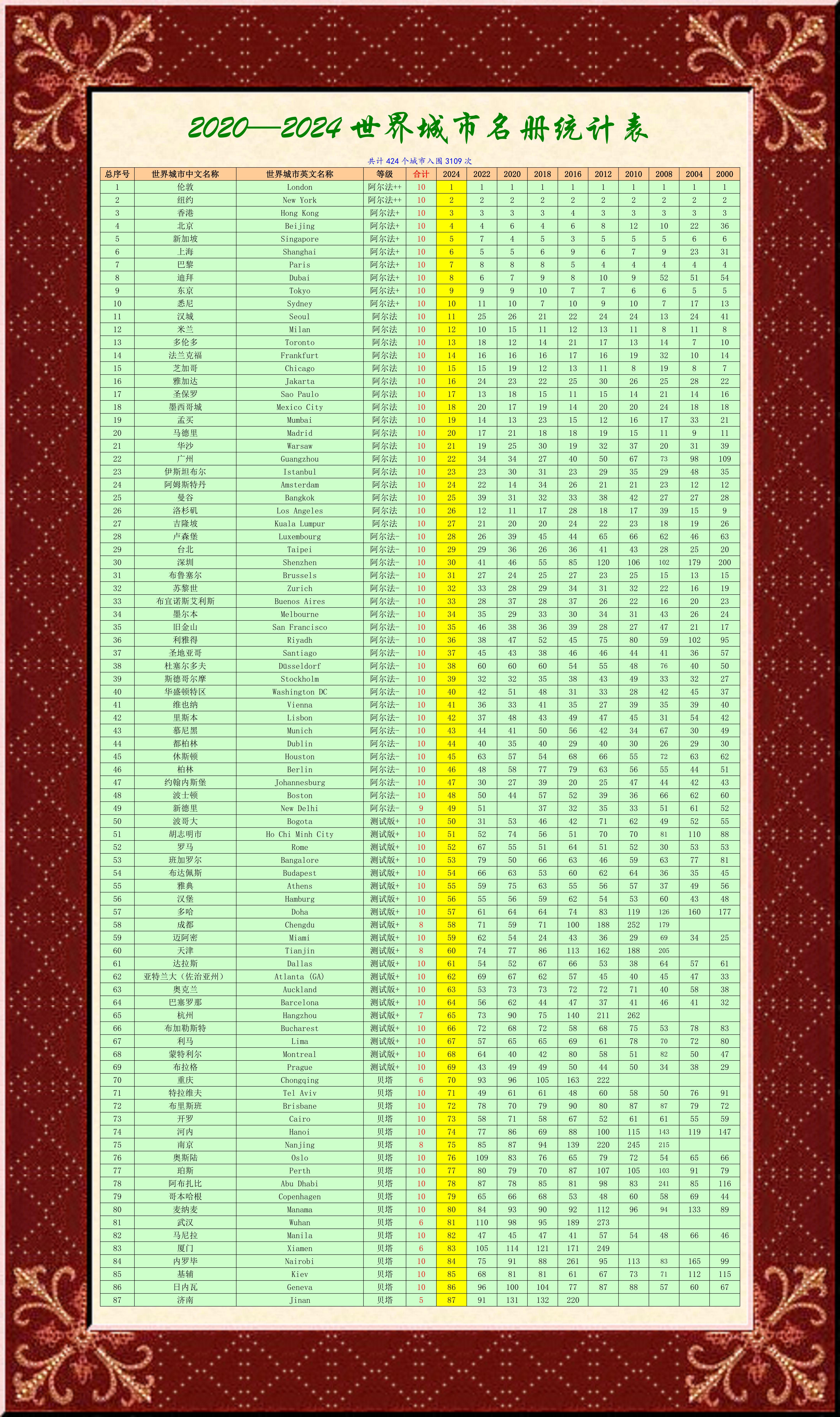 花了整整三天的時間,把2000-2024二十五年十期的《世界城市名冊》匯總統計,看看地球數以萬計城市中的名城名市,究竟哪些城市最美麗最壯觀!也看看我們中國的城市有多少能夠與世界名城一較高低!