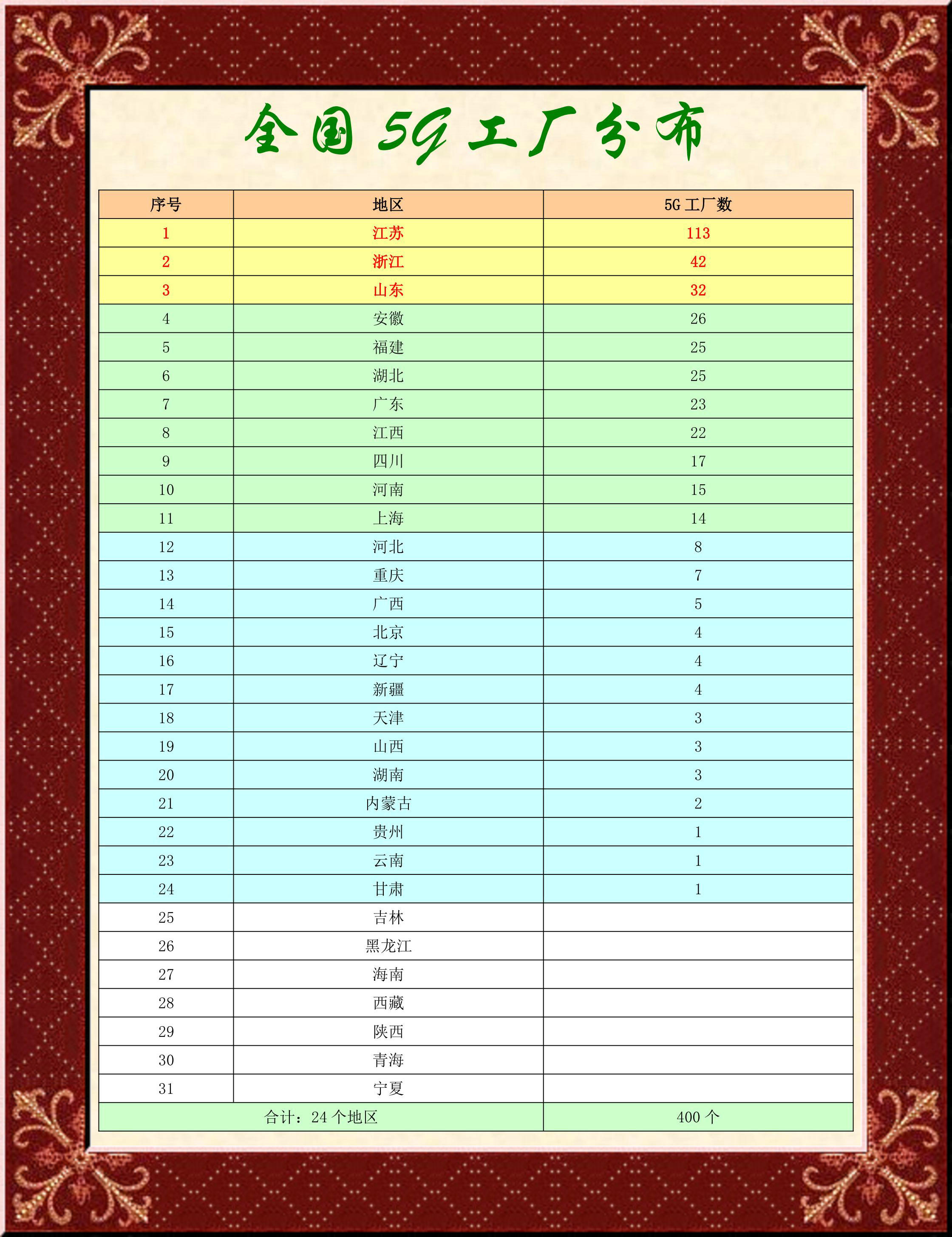 工信部公示全國400家5G工廠名錄,江蘇以113家獨占鰲頭,浙江、山東以42和32家成為第二、三名。如果再加第四名安徽的26家,總數(shù)213家,超過全國一半還多。