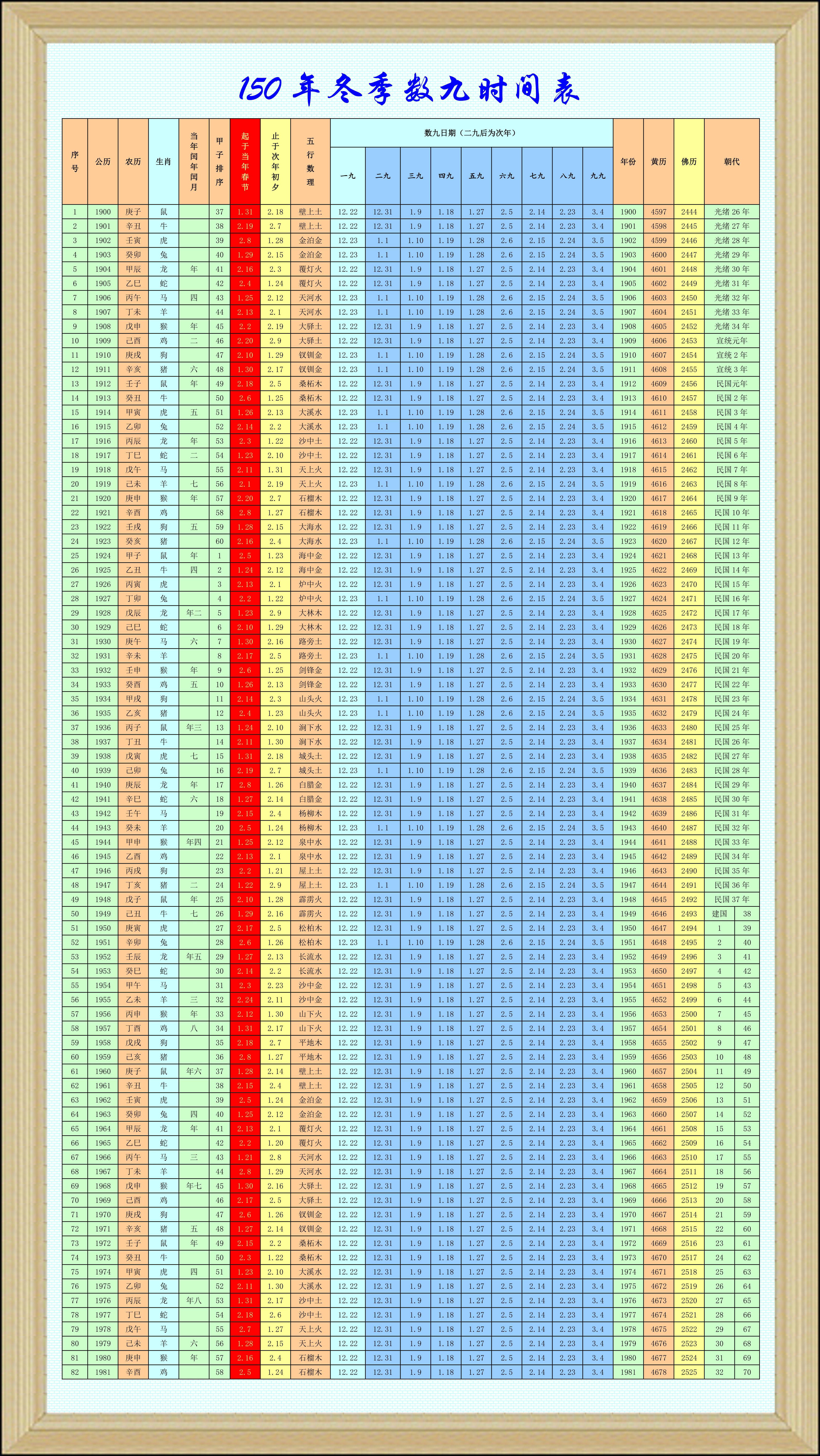 每9天為“一九”,一共是九九八十一天,通過計算得知,具體時間表如下: