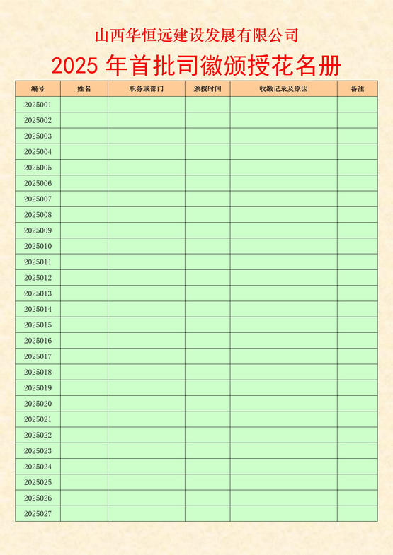 編號為2025001——2025100,共計100枚。按公司任命和安排工作職務登記造冊依序頒授,離職或辭退員工,必須收繳,以為后續(xù)者循環(huán)佩備之用!