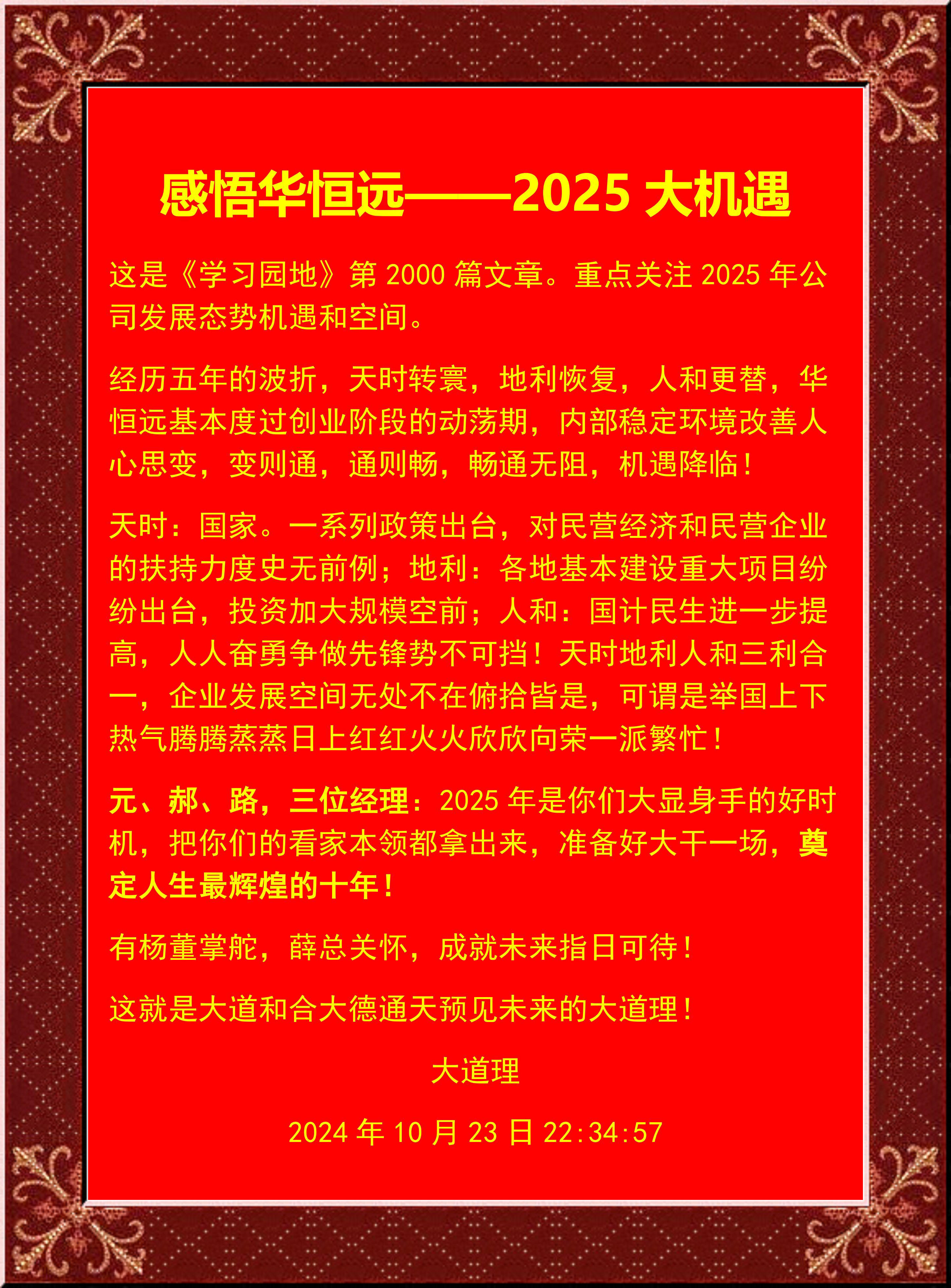 去年3月30日會晤,現(xiàn)在公司中任職有六人,其余四人為公司外圍發(fā)展戰(zhàn)略和未來的自家人。今年最大的收獲,是蘇女士張先生夫婦成為華恒遠成就未來大空間永久的戰(zhàn)略合作伙伴!這就應驗了十三這個吉祥如意人氣數(shù),與我們公司名稱相輔相成的還有太原華盛達軟件科技有限公司和山西富新廣建達建材有限公司,三個十三相加三十九,就是天機!